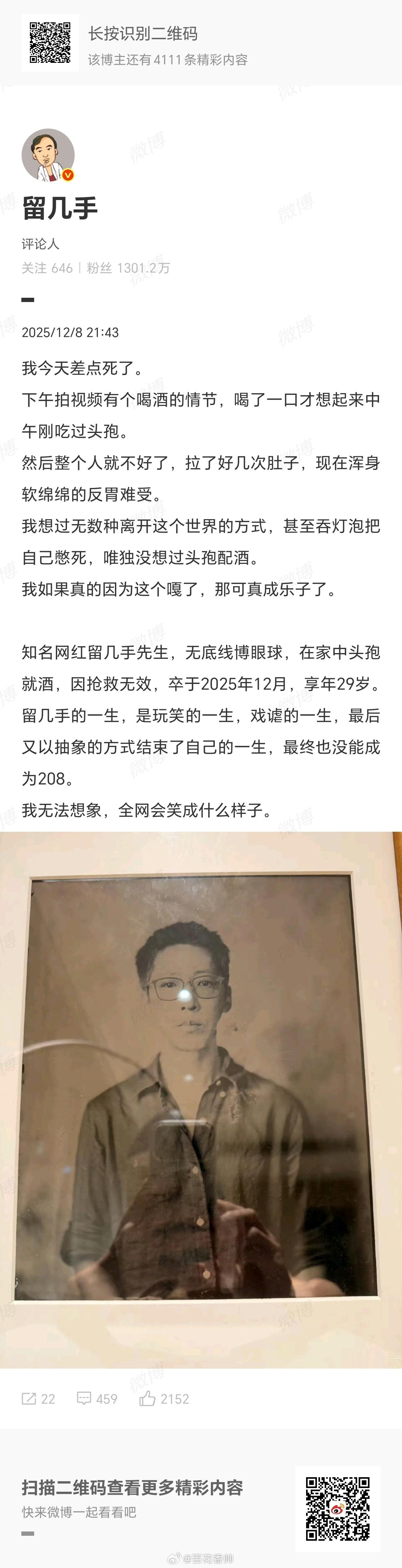 留几手头孢配酒留几手近几天骚操作像极了失控的艺人,原因是前期葛夕参加相亲综艺,一时半会心理接受不了,于是留几手全球征婚要求女方是富婆想转角遇到真爱,他说有钱人才馋他身子,不是图他钱。结果不知是走神没走肾,拍喝酒的节目居然提前服了头孢,还发给葛夕求安慰。有点志气好不好,你全网这样闹,虽然广大粉丝一直拿你当情绪价值排泄站,但你也不能想不开,富婆不好找,但是负婆美女满大街都是,你可以填补一下空虚。很多人嘲讽你有点不支棱,如果你找到了富婆或者负婆,我点几串大腰子给你补补。