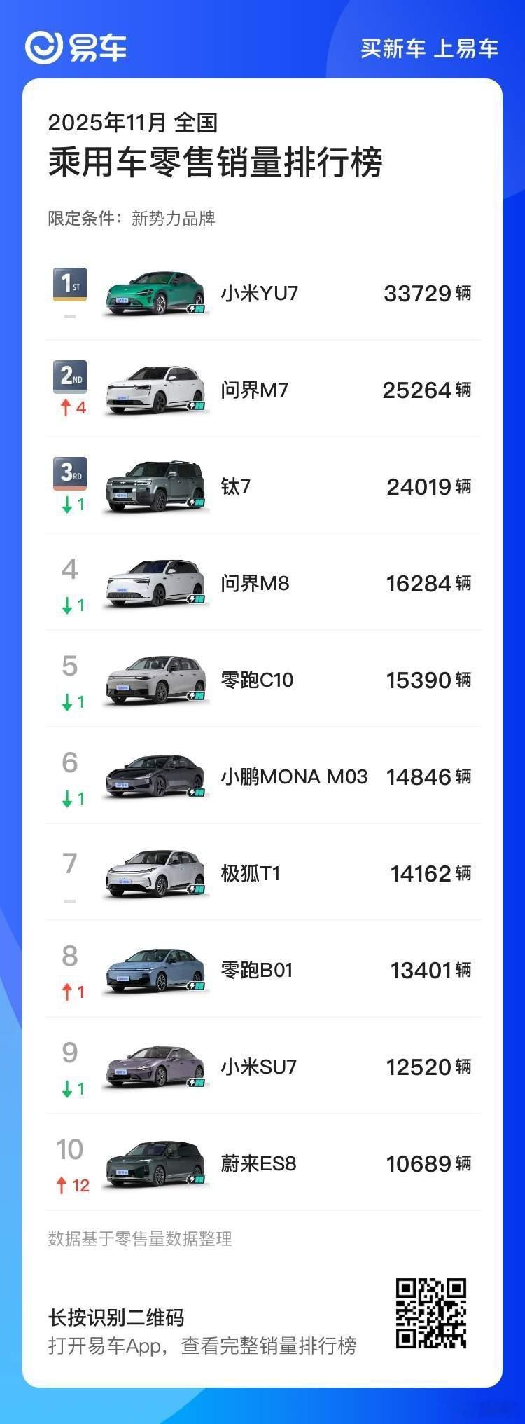 11 月新势力单车销量,钛7冲到第三了,卖了 24019 台,均价 21 万。大家怎么看?我觉得还有向上的空间