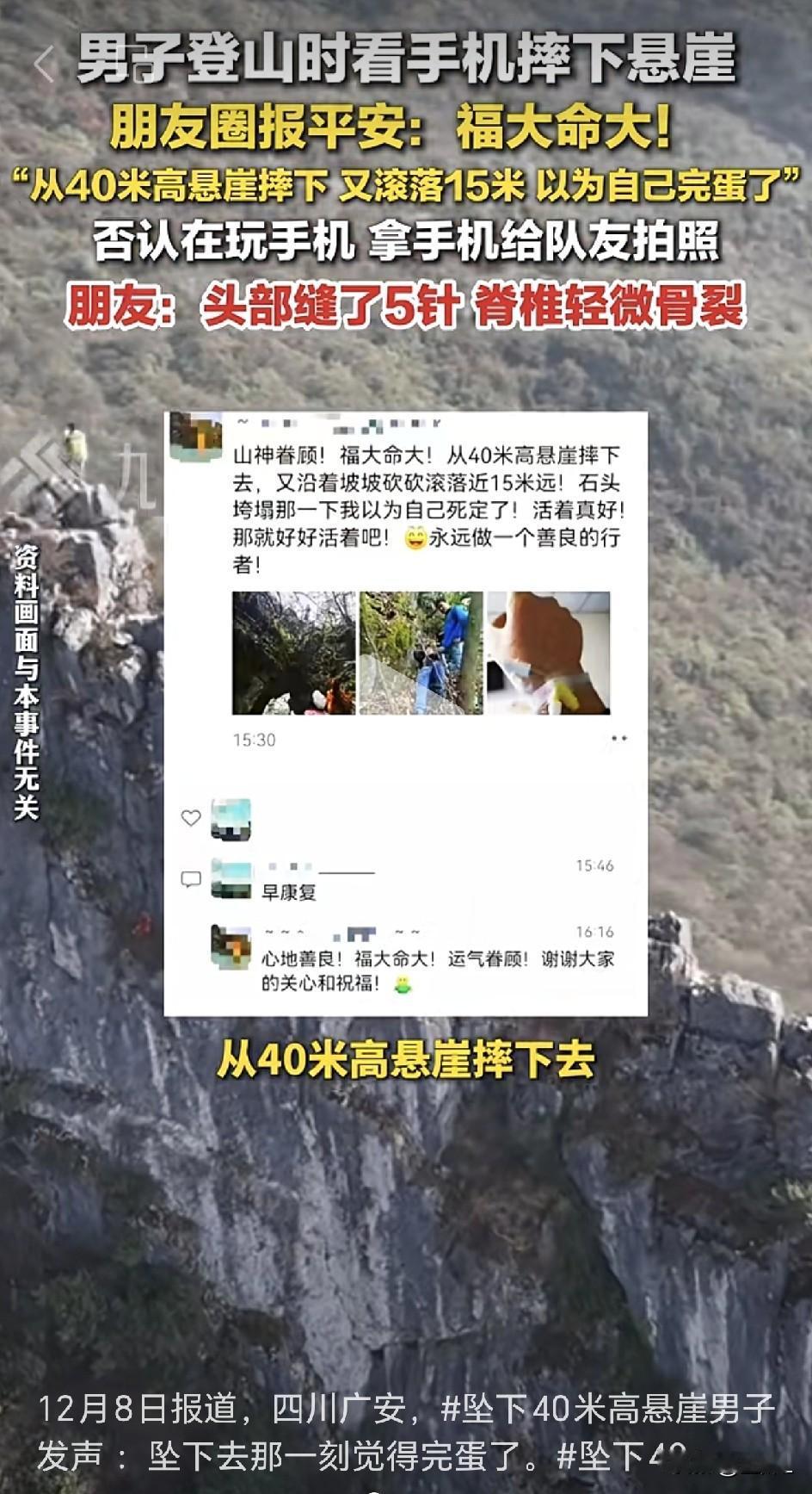 脚下一滑坠下40米悬崖,又滚了15米,他发朋友圈:福大命大!景区紧急喊话:那条路是“野路子”,千万别去! 大家觉得从十几层楼高的悬崖掉下去,会怎么样? 近日,四川一位老哥,就亲身试了一回——结果他爬起来拍了拍灰,居然发了个朋友圈。 这事儿就出在12月5号,华蓥山一段叫“刀片岩”的野山路上。 这位大哥是个户外老手,那天带着20多人的队伍去探“野线”。正帮队友找角度拍照呢,左脚踩的那块石头突然松了! 人就跟电影里似的,哗啦一下往下掉,垂直落差差不多40米,落地后又咕噜噜滚了15米才停。 等队友连滚带爬找到他,以为要出大事——结果人自己坐起来了,送到医院一检查:脊椎有点轻微骨裂,头上划了个口子缝了5针。 大哥发了一条朋友圈,配文是:“山神眷顾,福大命大,从40米高悬崖摔下去,又沿着坡坡砍砍滚落近15米远!石头垮塌那一下我以为自己死定了!活着真好! 那就好好活着吧!永远做一个善良的行者!” 景区一看视频都懵了:“这地方根本没开放啊!”赶紧喊话说,“刀片岩”那是纯野生区域,危险得很,严禁进入。 警方也表示没接到报警,但顺便提醒大家:野路子好玩,命只有一条啊! 至于网上有人说他“玩手机掉下去的”,大哥说:“我是帮人拍照!石头自己垮的,这锅手机不背!” 还有人传是深圳排牙山,也是离谱——闹这么大动静,分明是四川华蓥山本土“出品”的惊险大片。 所以说,各位喜欢爬山探险的朋友:风景再美,也得走正经路。不然下一回,可能真没这么运气好,还能发朋友圈了。 安全提示:探险不冒险,风景在眼里,平安在家里。 信息来源于九派新闻,侵联删!