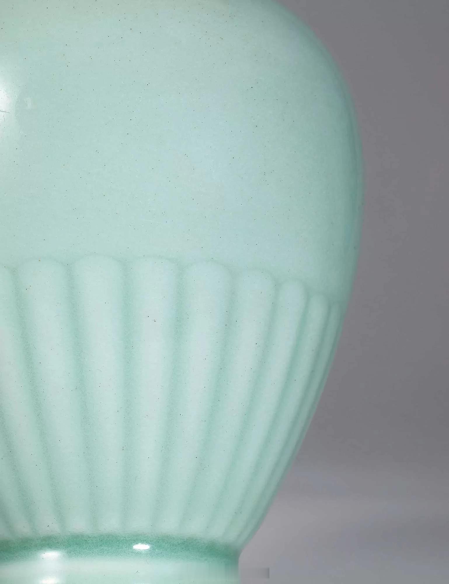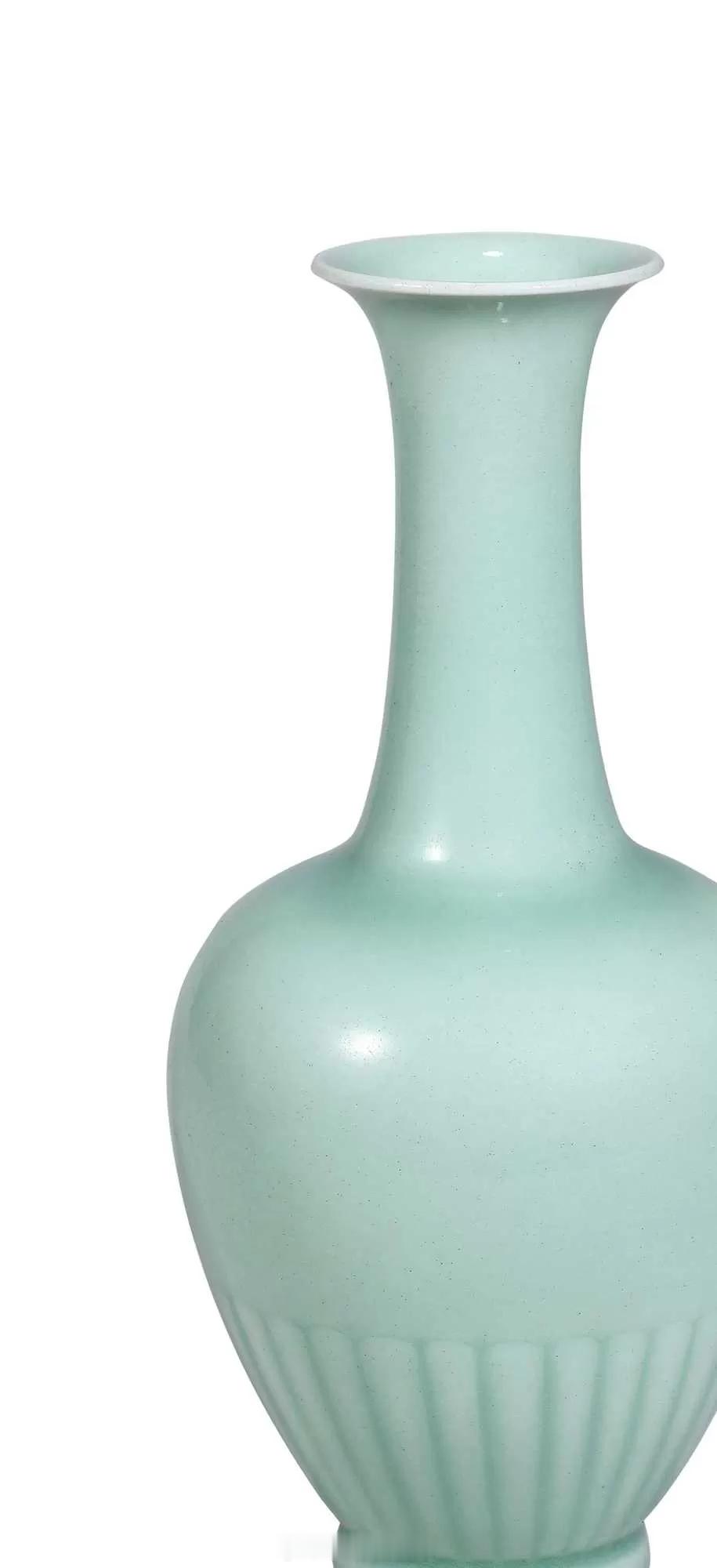 悦色集 | 清康熙 粉青釉菊瓣瓶本品撇口,长颈,丰肩,肩下敛收,圈足。通体施粉青釉,口沿白釉,下腹至足圈上凸雕菊瓣纹一周。底施白釉,中青花书「大清康熙年制」六字三行楷书款。尺寸:高21.5cm来源:保利2025秋拍《禹贡—纵横以和,天府永藏》