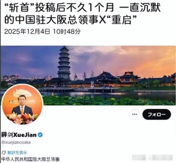 沉默1个月后,中国驻大阪总领事再度发文,没威胁高市,薛剑作为中国驻大阪总领事,却遭到了日本民众的围攻,这已经不是一件单纯的政治外交事件,而是日本右翼有意对中国的围攻,此前薛剑的“斩首”发言让其遭到了日本的围攻,薛剑并未指名道姓,只是说了想说的话,但是有些人却对号入座十分生气,日本右翼借此炒作,直接把薛剑列入了不受欢迎名单。 最近中日之间这场外交风波,得从日本首相高市早苗那番话说起,11月7日她在国会明确表态,要是台湾发生冲突波及日本,可能会动用集体自卫权,这话等于是把干涉中国内政的想法摆上了台面。 这话刚出,中国驻大阪总领事薛剑当晚就在社交平台上有了回应,说那种伸到不该伸地方的肮脏头就该斩掉。 虽说没点名,但谁都能联想到是针对啥言论,这位1968年生的江苏外交官,从北京外国语学院日语系毕业后就一直在对日外交领域工作,2021年开始担任驻大阪总领事,算得上是熟悉日本情况的“老外交”了。 帖子很快被删,可截图已经传开,日本右翼瞬间炸了锅,自民党外交调查会直接通过决议,要求把薛剑列为不受欢迎人物。 大阪总领馆门外出现了抗议人群,邮箱里塞满带断头照的威胁邮件,甚至有染红的塑料刀和画着血线的头像被扔在门口。 网上更热闹,极右账号公开领馆位置,号召“行动”,美国驻日大使也插一脚发帖批评,转头又悄悄删掉。 说白了,普通日本民众的情绪被带着走了,可日本政府的操作挺双标。 他们对着薛剑的话抗议不停,官房长官公开谴责,却对自家右翼的死亡威胁睁一只眼闭一只眼,警察也就象征性站个岗。 中国外交部当即回怼,说该反思的是日方先踩红线,今年还是抗战胜利80周年,日本在台湾问题上本就该有敬畏心。 薛剑之后没再发声,账号沉默了近一个月,就在大家以为事情会僵持下去时,12月3日他突然更新了内容,转发驻日大使吴江浩的帖子,从历史角度提日本该遵守一个中国原则,全程没提任何激烈言辞。 紧接着又发了贵州乡村、吉林风景的照片,分享中日科技合作的新闻,领事馆还办了线上美食讲座。 这转变其实很明显,不想让矛盾继续升级,日本那边的热度也慢慢降了,右翼的抗议少了,外务省私下还说欢迎建设性对话。 毕竟中国是日本最大贸易伙伴,真闹僵了对他们没好处,之前自民党喊着要驱逐薛剑,内阁根本没敢通过。 这场风波看着是外交官言论引发的冲突,核心还是日本右翼在借题发挥。 高市早苗刚上任就想靠对华强硬转移国内压力,右翼趁机煽风点火,把正常的主权表态炒成“威胁”。 好在双方都没真往死里闹,薛剑用后续的温和发声给了台阶,日方也没再揪着不放。 以上都是个人观点,对此您有什么不同的看法,可以在评论区留言讨论!!!