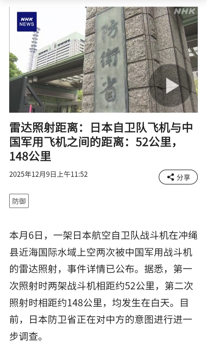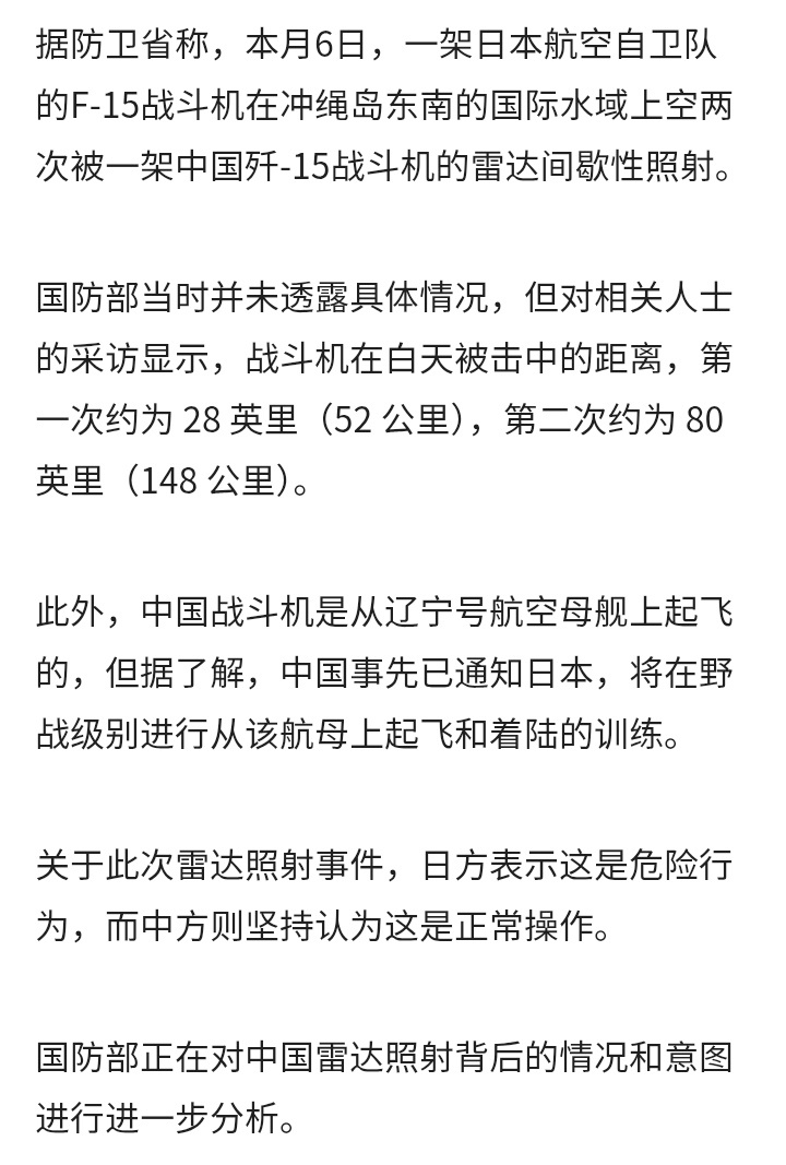 日本自卫队滋扰辽宁舰训练日本NHK披露了事件详情,第一次两架战斗机相距约52公里,第二次相距约148公里,均发生在白天。
