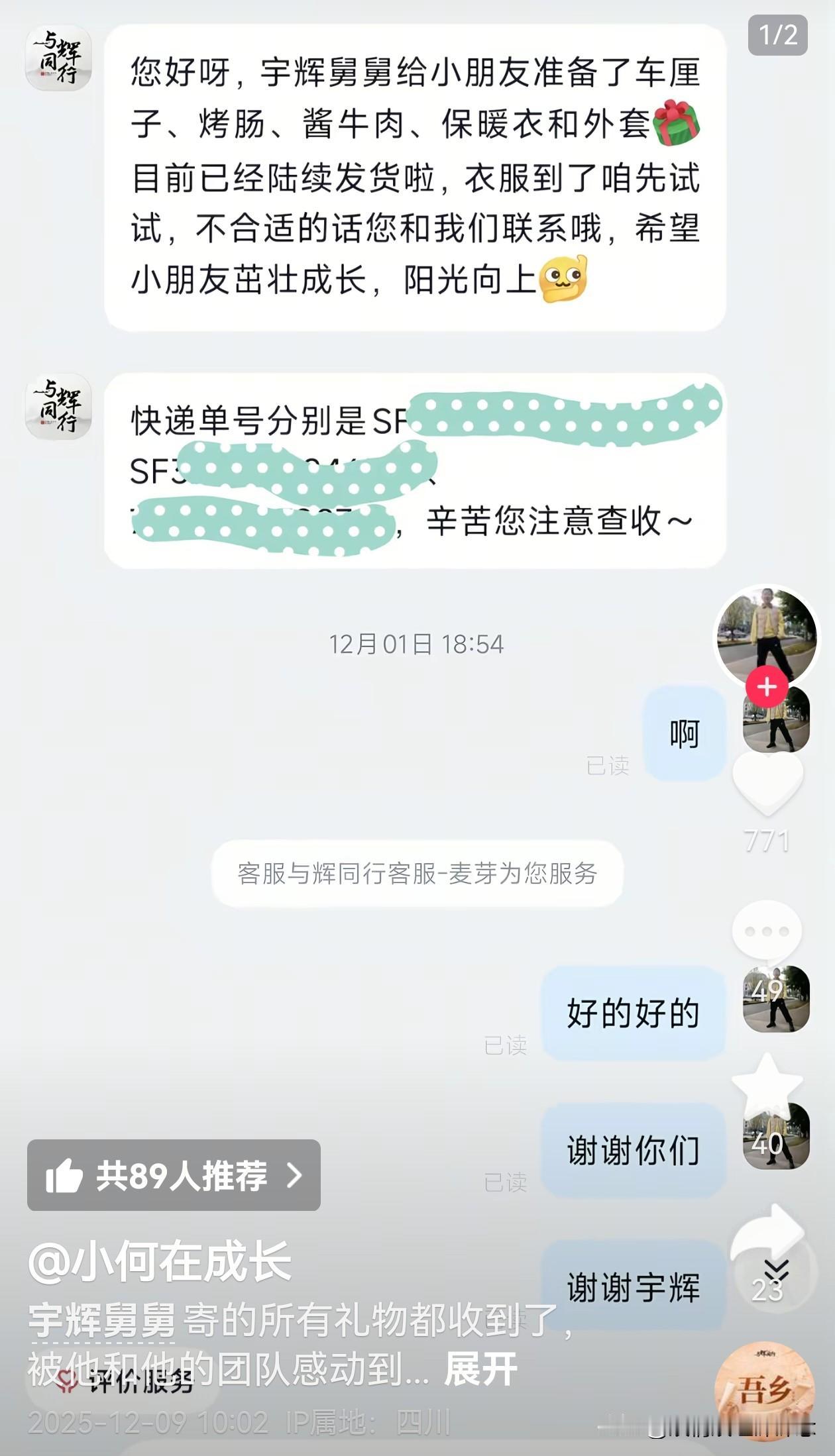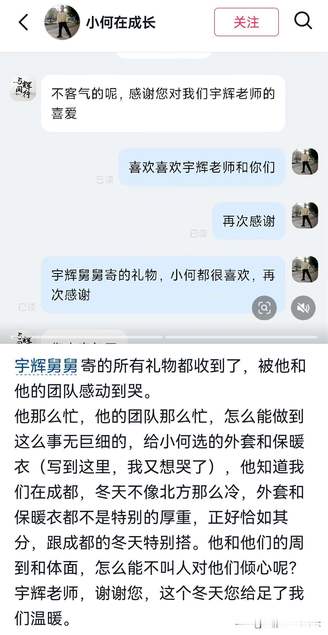 没想到这事还有后续, 那个被妈妈逼着看宇辉推荐的书的小何同学,不止收到了车厘子,还收到了烤肠,酱牛肉,保暖衣和外套。 谁能想到,一个“吐槽”的视频,带来的连锁反应,是一个双向奔赴的故事。小何妈妈说:“他知道我们在成都,外套和保暖衣都不是特别厚重,和这个冬天特别搭。” 是啊,宇辉和“与辉同行”那么忙,怎么能做到这么事无巨细?他们没只顾着送东西,还特意去留意了成都的气候,选了适配的衣物厚度,宇辉团队的这份细致,没有一点高高在上的距离感,反倒像身边朋友一样,把妥帖和温暖送到了心坎上。 宇辉一直说的“做有温度的事”,大概就是这样吧。没有空泛的口号,而是在这些旁人可能忽略的小细节里,藏着对陌生人的在意和体谅,也让这个冬天,多了好多暖乎乎的人情味。 董宇辉