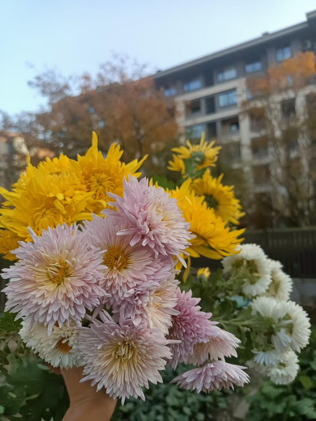 秋日暖阳下,一束五彩缤纷的菊花在手中绽放,仿佛整个世界都变得温柔起来。🌸🌻🌼