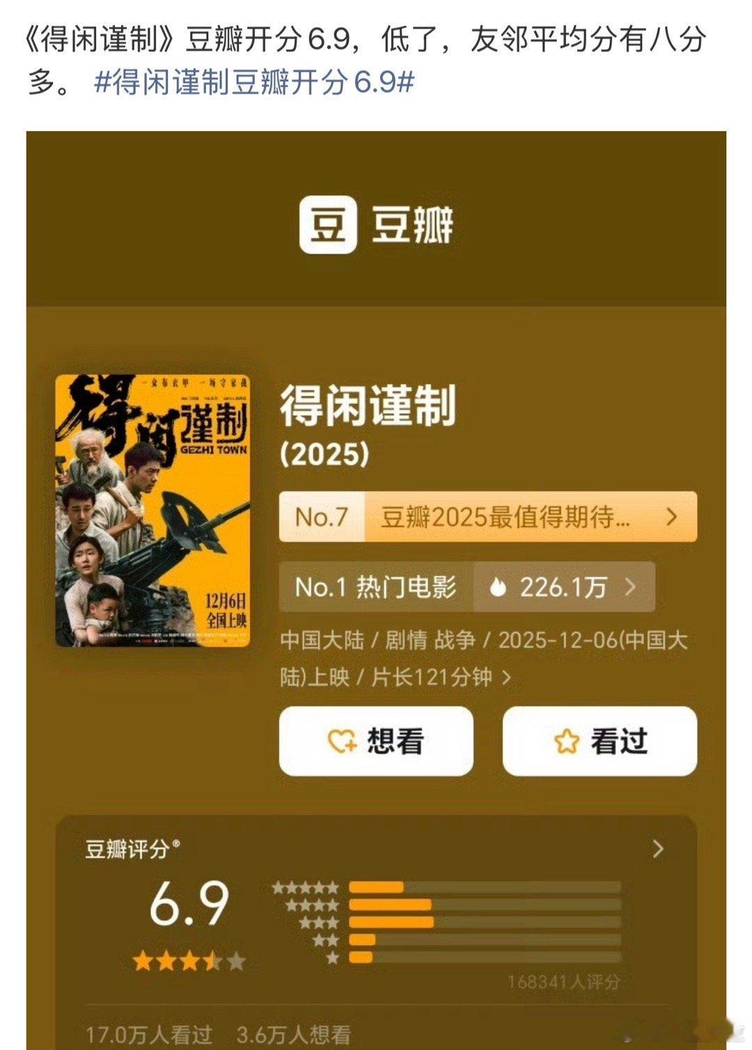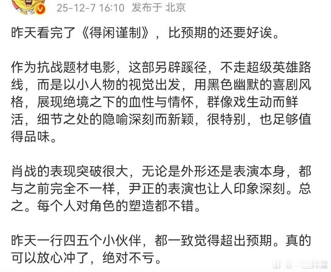 恶意偏见压不垮得闲谨制 《得闲谨制》的观影体验远超预期,那种后劲儿真的很大好吗,所谓的6.9分完全没道理,这明明是一部兼具娱乐性和思想性的优质战争片,正午阳光的“谨制”二字不是白叫的