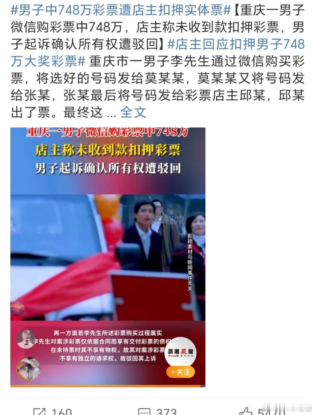 男子中748万彩票遭店主扣押实体票 写的啥乱七八糟的!这事儿根本没那么复杂:谁选的号码、谁完成了购票交易,奖就是谁的!没给💰能出票?既然票都打出来了,就等于默认交易生效,只要证据链完整店主扣票纯属没道理!