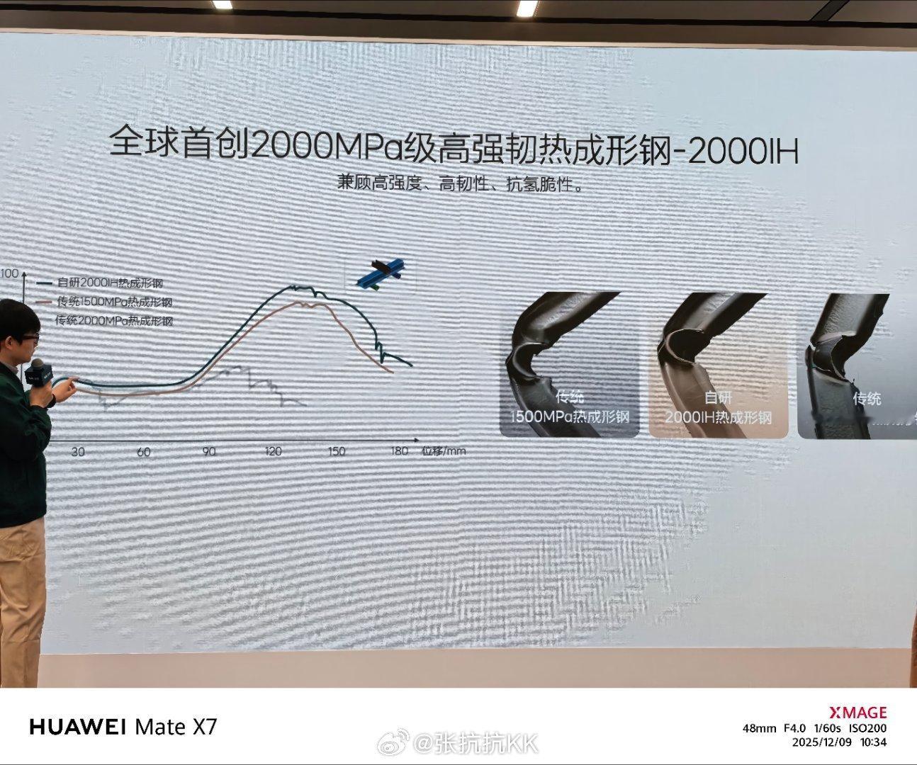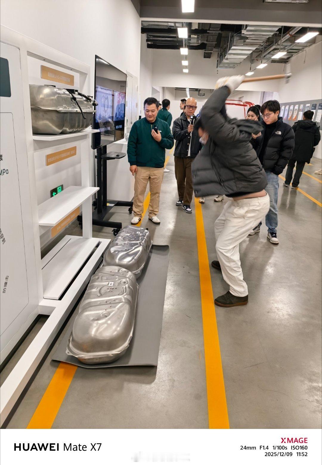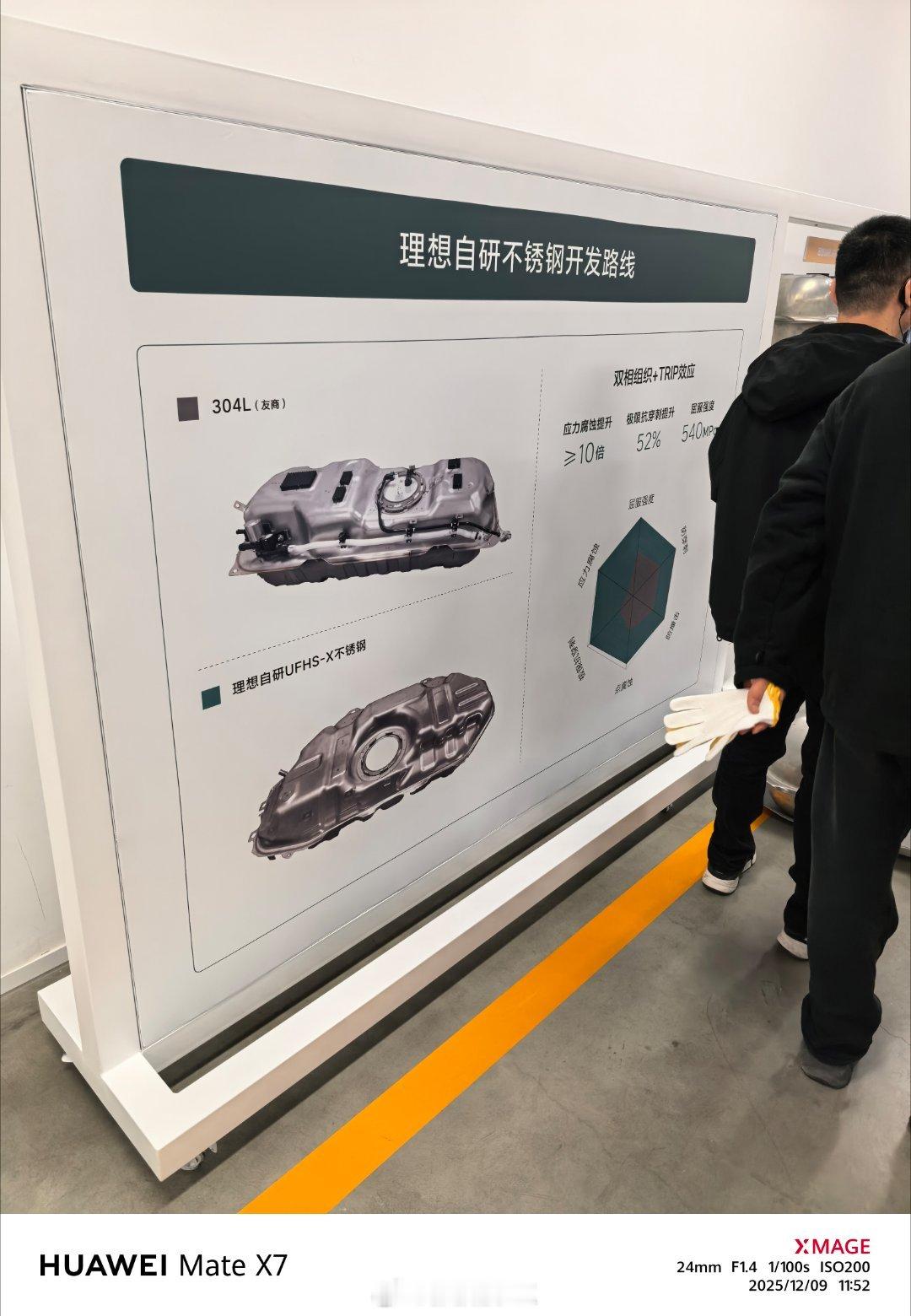 高韧性不锈钢材料,用来做高压油箱。现场给个锤头砸一砸对比,之前其实在安亭办公室,和已经砸过一次了。还有2000MPa的、增强韧性的高强钢,并科普了不应该只看强度。理想材料研发成果大盘点
