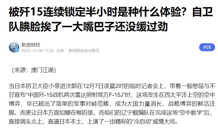 中日空战将一边倒,中方不仅仅依靠战机强大,因为还有别的杀招! 12月6日,中日战机在相关空域的对峙,与其说是军事力量的短暂碰撞,不如说是给日本上了一堂直观的实力认知课。 不少人过去总觉得日本航空自卫队装备精良,可真到了实际对峙场景中才发现,两国空中力量的差距早已不是一星半点,而是全方位的代际鸿沟。 这种差距不是某一款装备的优劣之分,而是从装备基础到配套体系的系统性落后,让日本所谓的“空中优势”彻底现了形。 先说说双方的主力战机。日本看家的F-15,说是主力其实早就“廉颇老矣”。这批战机大多是几十年前的老型号,大部分压根没进行过像样的现代化升级,基本还停留在出厂时的水平。 而我国的歼-15系列,尤其是改进型,无论是机身结构还是航电系统,都是按照现代空战需求设计的。单说核心的空战武器,F-15J主要靠的AIM-7导弹,跟歼-15B的PL-15比起来,技术上差了足足三十年。 就算日本想用更先进的AIM-120,也得先给战机升级,可现在完成升级的没几架,导弹数量还被美国卡着脖子,真打起来根本不够用。 雷达和电子战能力的差距更要命。F-15J装的还是老掉牙的机械扫描雷达,天线尺寸又小,稍微有点现代电子干扰就歇菜。 日本本来想靠E-767预警机补短板,可这款预警机用的是上世纪八十年代的雷达技术,跟我国的KJ-500比起来性能差了一大截,更别说专门为航母配套的KJ-600了。 更关键的是,我国还有歼-15D这款电子战“杀手锏”,专门负责伴随干扰和反辐射打击,日本连同款专用电子攻击机都没有,只能靠普通战机凑数,专业和业余的区别一下就显出来了。 实战能力的差距更能说明问题。F-15J有个致命缺点——没有反舰能力。当年美国转让技术时就卡了脖子,不许日本强化对地对舰攻击能力,现在F-15J连合适的反舰武器都没有。 而我国歼-15系列既能空战又能反舰,再加上歼-15D的配合,形成了完整的攻防体系。 就拿预警机对抗来说,歼-15D只要发现日本E-767开雷达,就能精准定位,再用反辐射导弹实施打击,这在印巴空战中已经有过成功先例,对日本来说可不是吓唬人的。 这次对峙让日本彻底看清,所谓的“空中优势”不过是过去的幻影。F-15J的老旧、武器的受限、电子战能力的缺失,再加上配套体系的落后,构成了无法弥补的差距。 我国从战机研发到配套装备,再到作战体系,都是自主可控的完整体系,而日本处处受美国限制,装备更新和技术升级都要看别人脸色。 说到底,这种差距是工业实力和国防自主能力的体现,不是靠买几架先进战机就能弥补的。 如果日本真敢越过红线,只会真切感受到这种差距带来的教训,这也是对峙最现实的警示意义。