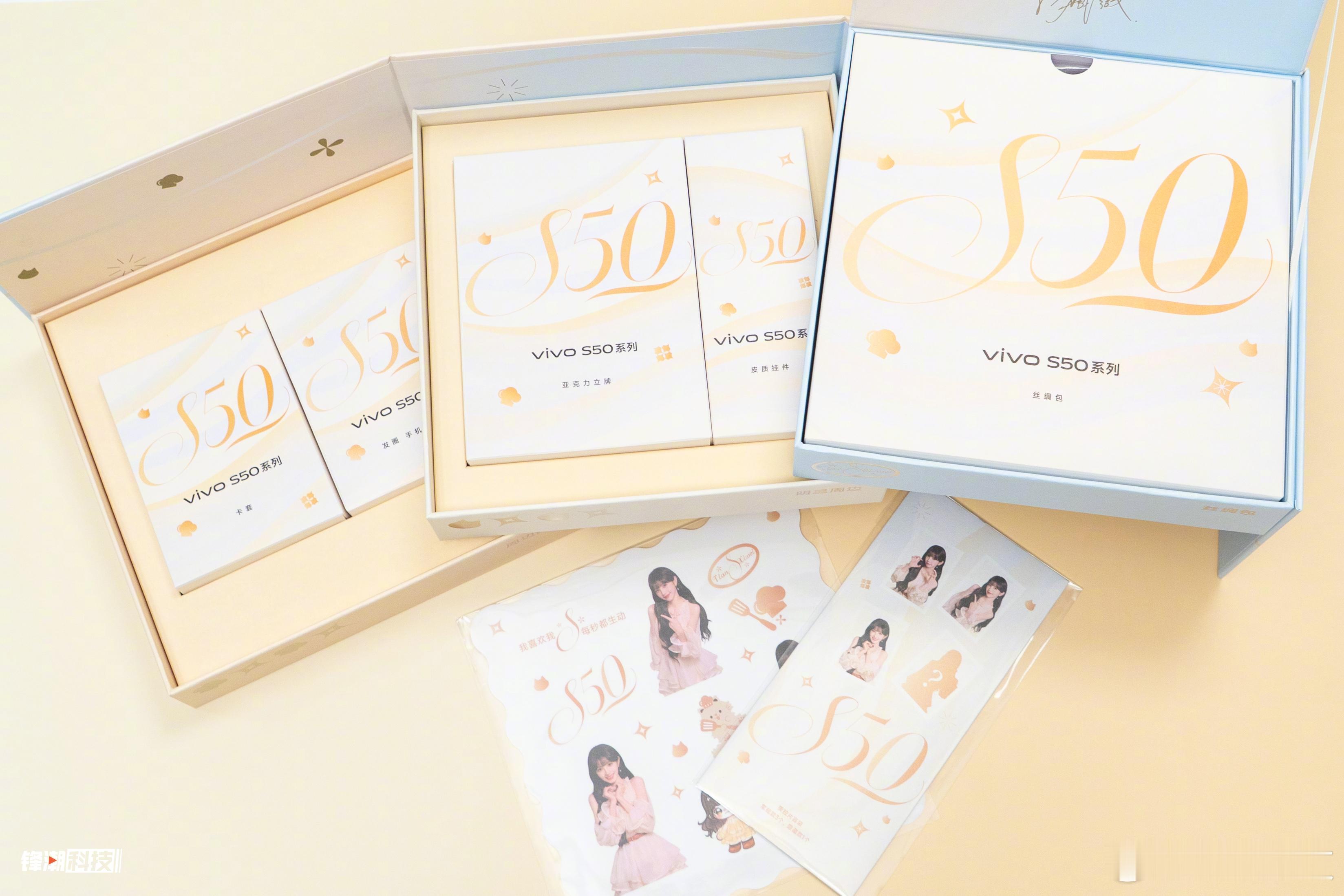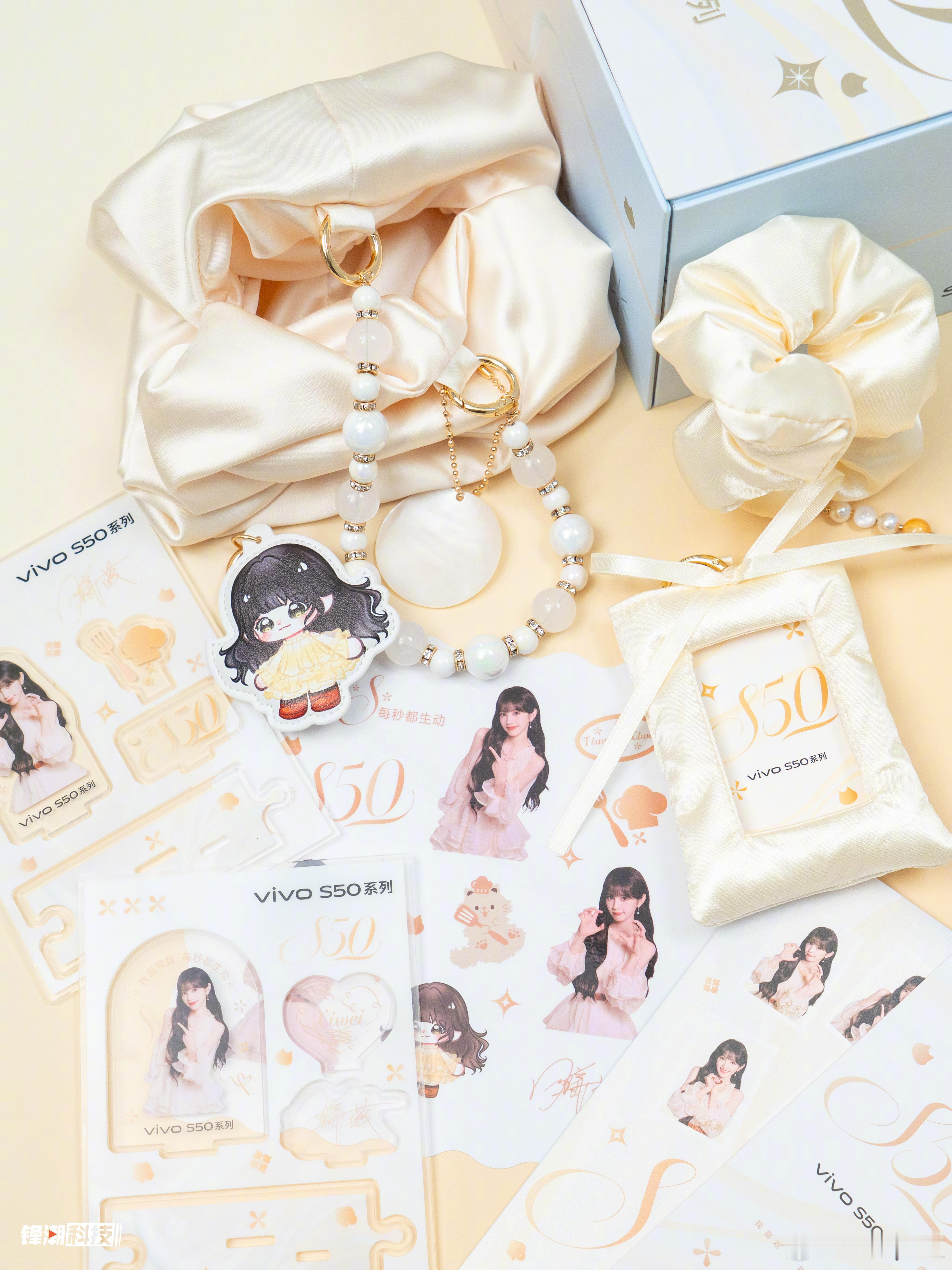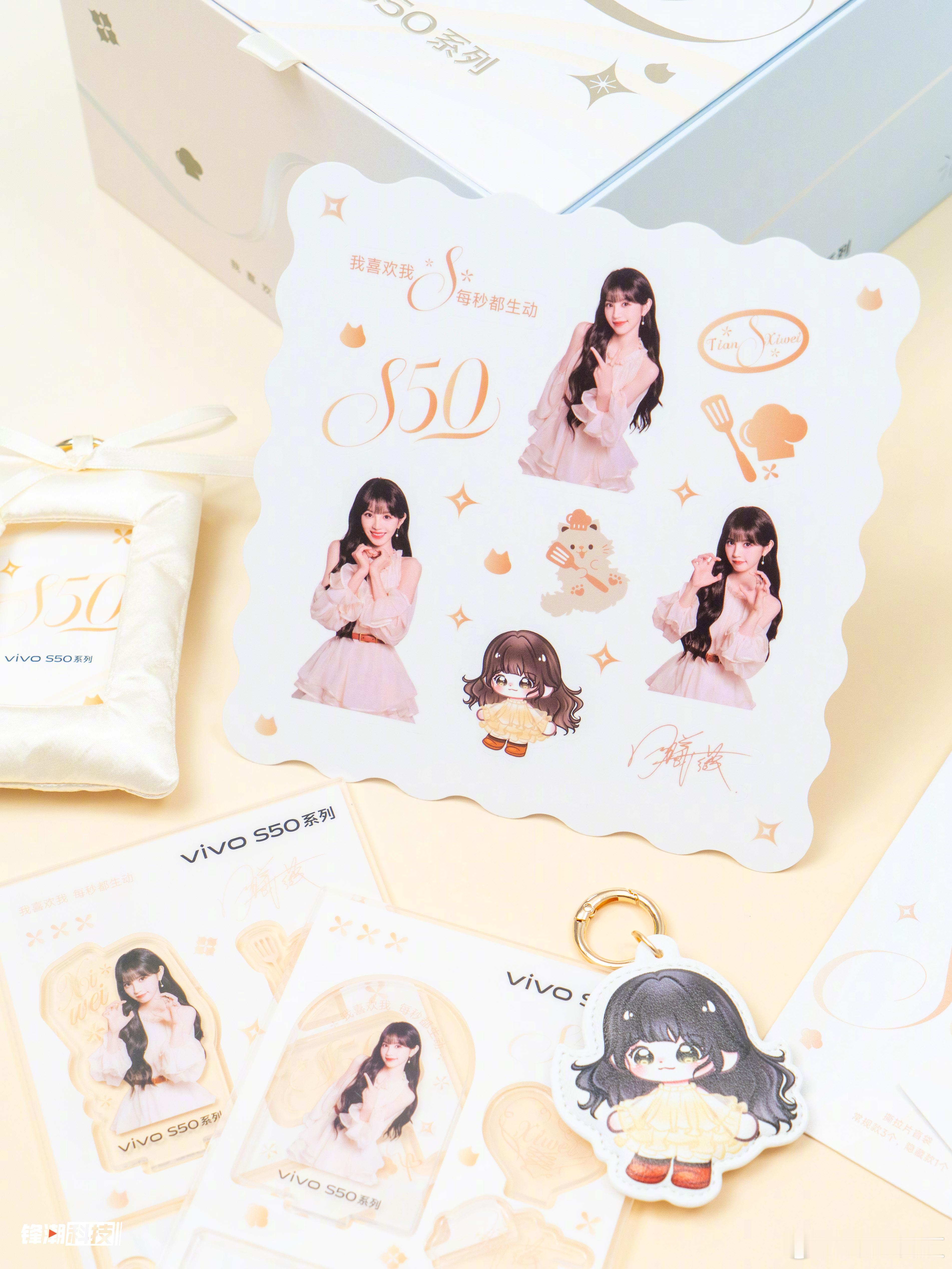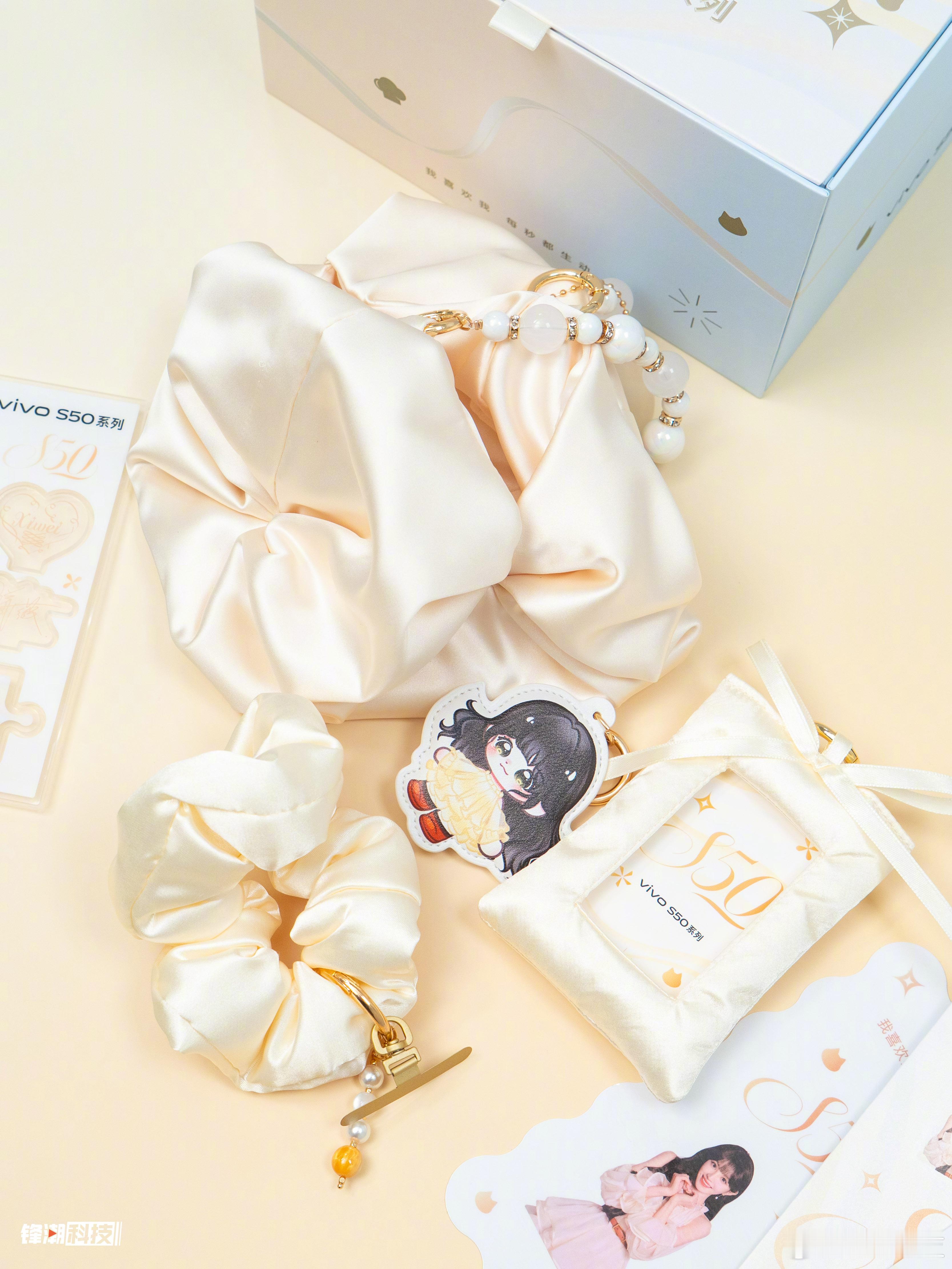 vivoS50系列田曦薇限定礼盒。丝绸包、亚克力立牌、皮质挂件、贴纸、发圈、卡