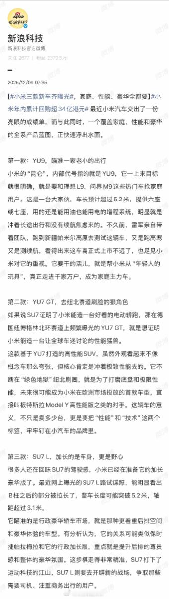 小米三款新车齐曝光 小米YU9定位6座家庭大SUV;小米YU7 GT主打性能,性能猛兽;小米SU7 L 定位加长版行政车小米汽车新能源汽车