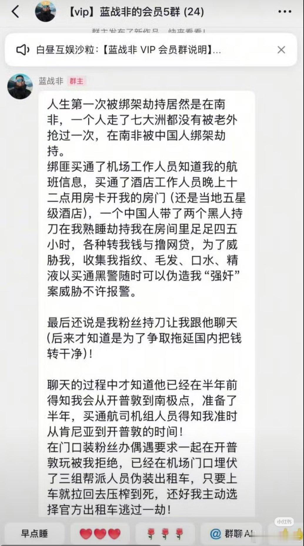 蓝战非称被强迫拍裸照总感觉国外的治安很差这下蓝战非用亲身经历证明了根据蓝战非描述,是机场、公职人员、酒店都能买通,最后在酒店被入室囚禁、逼迫转钱、撸网贷,而且还是同胞策划半年,带着两个黑人持刀完成的,最变态的是还获取了蓝战非的指纹、毛发、精液、口水,以威胁“强奸”,防止报警!?精心策划半年,这得有多可怕?估计这次蓝战非损失不小,而且以后也不敢这么高调去旅游了吧!!你们猜这次事件会有后续吗?
