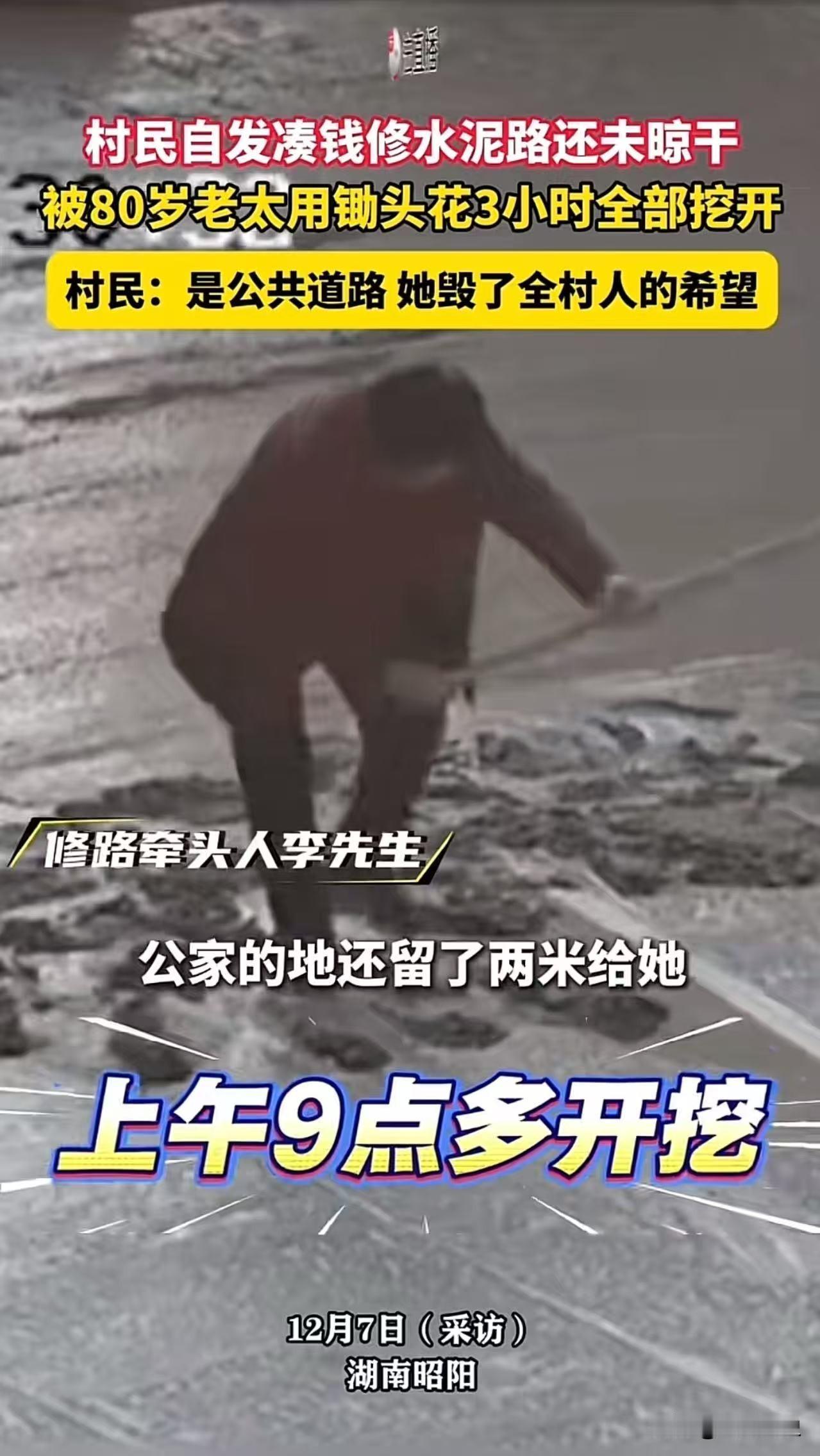 12月7日,邵阳,村民自发凑钱修水泥路,结果水泥还没干,就被 80 岁老太太用锄头花 3 小时全部挖开,老太太:你们修路占了我家的地!负责人:“这不是她家的地,公家的路还给她留了两米,可她就是要把修好的路给挖了,报案都没用,全村的希望都被她毁了!” 湖南邵阳某村,村民集资将一条土路修成水泥路,路修好不久,一位80岁的老人用锄头将新铺的路面挖开。 据修路组织者老李介绍,这条路原本通行不便,村民按家庭情况出资或出力,共同完成修缮,路面被挖开发生在水泥未完全凝固时,老人持续作业数小时。 老人表示,修路占用了她家的土地,但老李及村里负责人称,此路为公共道路,规划时已在老人房屋一侧特意留出两米宽的距离,未占用其土地。老人不接受这一解释。 村民发现路面被破坏后,因老人年事已高,未上前阻止,选择报警处理,警方到场对老人进行劝导后离开,但老人随后继续挖路,此过程重复数次,路面最终受损。 老李作为收款和组织者,面临如何向出资村民交代的问题,老人拒绝赔偿,并曾表示若路被修复,她会再次挖开,目前修路事宜已暂停。 看了湖南邵阳这个村里村民们自发凑钱,好不容易把一条让人头疼的泥巴路铺上了水泥,结果水泥还没干透,就被村里一位80岁的老太太,花了三个多小时,用锄头给挖开了,这事儿一传开,网上立刻就炸了锅。 “这老太太是真不讲道理,还是背后有人撑腰?” “这摆明了就是无理取闹,仗着自己年纪大,大家拿她没办法。” “我们那儿也有个老太太,谁家修路修桥她都去捣乱,后来她儿子结婚那天,村里唯一的桥‘恰巧’坏了,接亲的车都进不来,大家心照不宣,没人吭声,也没人去修。” “警察来了四次都没用,法律难道管不了‘老赖’?” “法律面前人人平等,不能因为年纪大就网开一面,破坏公共财物,就该依法处理,该罚的罚,该拘的拘。如果老人自己赔不起,就该找她的子女负责。” “好好的路被毁了,最伤的是人心和信任。” “最怕的就是这种,你热心为大家办事,结果遇到一个胡搅蛮缠的,把所有人的心血都毁了,以后谁还敢站出来牵头?” “这件事里,没有一个人是赢家。” “除了气愤,我们更该想想怎么办。” 如果你是这个村的村民,面对这种情况,你觉得有什么现实可行的办法能解决问题、追回损失? 你认为,在处理类似“高龄人员”的治安或纠纷案件时,执法部门应该如何既体现法律刚性又兼顾人文关怀?评论区留下的看法。 信息来源:极目新闻
