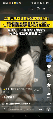 “只要你今天跟我走,我就当今天的事没有发生!” 女友出轨自己的好兄弟,被男子捉了个现行。女友坐在床边,而好兄弟淡定地玩着手机,丝毫不慌! 男子气愤至极,想着前不久刚跟女友一起做了流产手术,大声质问好兄弟“这次这个种算谁的!” 两人默不作声,只听到男子孩子声嘶力竭地怒吼着。 男子沉默了许久,想到以后的生活,放下身段轻声地跟女友说“只要你今天跟我走,我就当今天的事没有发生!” 尽管如此,还是没有等到女友的回应,视频没有后续。 男子一次次原谅出轨的女友,以后可能会窝囊一辈子。 一次不忠,终身不用!不如早点放手,给自己一个体面,给他们一个体面!出轨 伴侣出轨 出轨男人 男子的出轨 约会出轨 出轨赔偿 出轨男