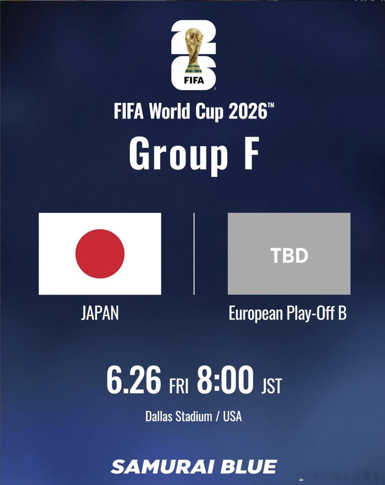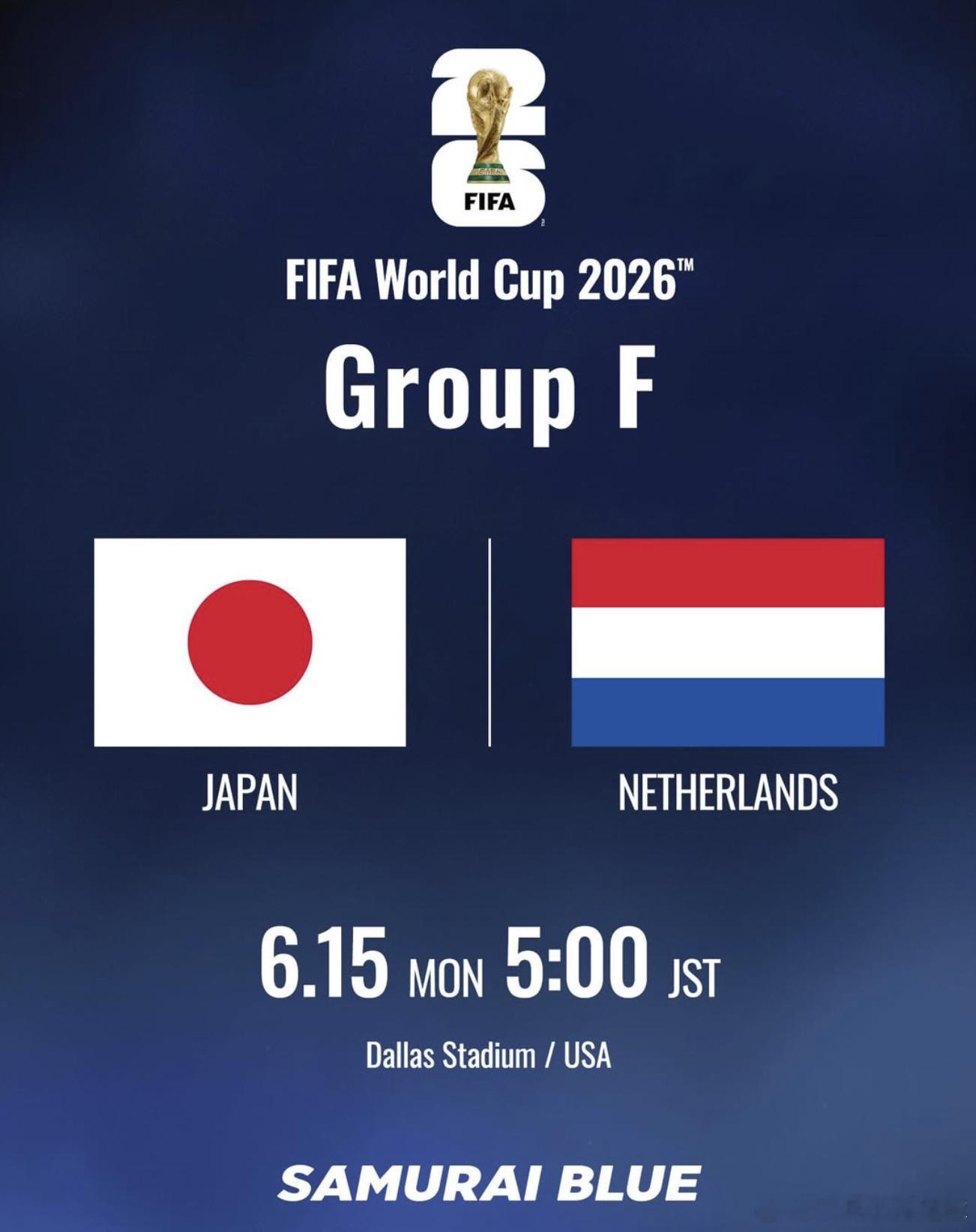 2026年北中米世界杯小组赛【赛程表】⌚️北京时间6月15日4:00KO🏟️达拉斯体育场/Dallas Stadium(美国)⚔️ 🆚 荷兰国家队🇳🇱⌚️北京时间6月21日12:00KO🏟️蒙特雷体育场/Estadio Monterrey(墨西哥)⚔️ 🆚 突尼斯国家队🇹🇳⌚️北京时间6月26日7:00KO🏟️达拉斯体育场/Dallas Stadium(美国)⚔️ 🆚 欧洲附加赛B路径胜者