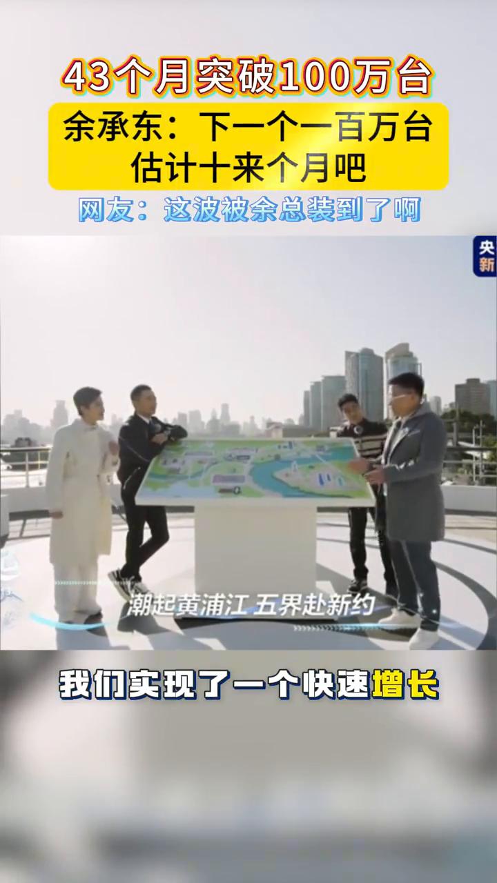 43个月突破100万台,余承东:下一个一百万台估计十来个月吧。网友:这波被余总装到了。 潮起黄浦江,五界赴新约。 上次用一百万台实现了100万台,估计下一个100万台的完成大概十来个月,实现了快速增长,这是一个非常大的里程碑。五个界的产品聚齐了,五个界产品都上市了,最后一个加入了尚界的产品,第一款H5也上市也大卖。