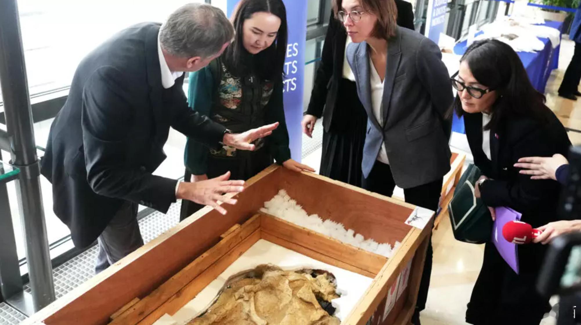 【法国将一副7000万年近乎完整的暴龙近亲骨架归还蒙古】海外新鲜事 在戈壁沙漠的土壤中保存了7000万年后,一具几乎完整的勇士特暴龙(T-Rex)骨架被非法挖掘出来。周一,法国将这副珍贵的骨架归还给蒙古。勇士特暴龙是著名暴龙的亚洲近亲。据法新社报道,巨大的头骨和三趾巨爪是这具恐龙标本的重要组成部分,这种物种曾是陆地上最大食肉动物之一,体长可达13米。在向蒙古国移交29件化石的仪式上,这些化石被展示了出来。这些化石是在2015年由法国海关查获的,当时正值化石走私活动愈发猖獗之际。法国公共账目部长阿梅莉·德·蒙沙兰表示:“这是法国与蒙古之间真诚的友谊之举,让这些化石能够继续启发研究人员、年轻一代,以及所有像我们一样被这些来自遥远之地的物品所感动的人们。”此外,法国海关在一家法国公司的场所查获了九箱物品,其中还包括食卵龙蛋。这种史前鸟类每次产两枚蛋,这些蛋几乎保持原状,呈大块圆角矩形,表面有鳞片,颜色为棕褐色。这批古生物学珍宝包括指骨、掌骨、牙齿、椎骨、股骨和爪子,还有两具不太重要的完整骨架。蒙古文化、体育和旅游部长安德拉姆·钦巴特(Undram Chinbat)向法新社表示:“我感激所有参与打击非法贩运的人士,非常为他们感到骄傲。这些恐龙化石回归祖国意义重大,它们是我们文化遗产的一部分。”这位蒙古女部长还表示,这些化石将在今年年底前运回蒙古,并将在“明年开放的自然科学博物馆”展出。一个世纪以来,蒙古的古生物宝藏一直遭受掠夺,近年来这些宝藏成为人们渴望收藏的对象,助长了非法走私网络的发展。法新社指出,经过法国海关情报局(DNRED)和国家反欺诈办公室(ONAF)长达数月的调查,法国在周一查获了这批此前通过韩国转运的文物。“化石博物馆”法国国家反欺诈办公室的一名调查员告诉法新社,这场走私活动的核心是一家位于法国中部的公司。搜查行动发现了“相当于一个化石博物馆的藏品”,这些化石不仅来自蒙古,还包括巴西、马达加斯加、中国、黎巴嫩、意大利和土耳其,甚至还有来自法国国家自然历史博物馆的藏品。据他透露,一个国际化石走私网络已被查获,“幕后主使在国外,中间人将该公司准备好的标本在法国转售给富人。”对于周一归还蒙古的文物,调查员透露,“幕后主使来自德国”。法国海关情报局局长塞巴斯蒂安·蒂兰向法新社表示,参与此类走私活动的人员“背景各异”,其中“许多人因痴迷收藏而失去理智,最终参与盗掘活动或通过非法渠道购买文物。”他解释说,“此外,还有更具组织性、真正犯罪性质的走私渠道,这些渠道属于相当封闭的圈子。”2024年,法国海关部门共查获60起案件,扣押了22,125件文化财产,其中包括104件化石。据海关统计,每年大约有两到三具恐龙骨架被非法出售,例如2020年在美国拍卖会上以近3200万美元成交的霸王龙骨架。法国国家反欺诈办公室的调查员指出:“化石走私仍在继续。我们不能抱有幻想。”图:蒙古国文化、体育、旅游和青年部长安德拉姆·钦巴特(左)与法国公共账户部长阿梅莉·德·蒙沙兰(右)在史前文物移交仪式上聆听法国国家自然历史博物馆古生物学专家(左)的讲解。 AFP - DIMITAR DILKOFF