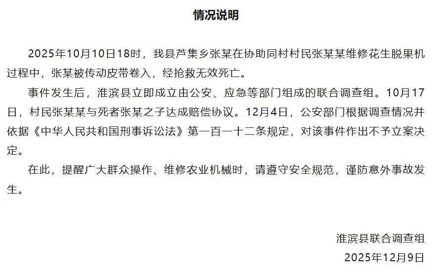 #男子修机器被绞亡后双方达成赔偿#【河南一男子维修机器时被绞身亡,官方通报:同村村民与死者之子达成赔偿协议,公安部门不予立案】12月9日,河南信阳淮滨县联合调查组发布情况说明:2025年10月10日18时,我县芦集乡张某在协助同村村民张某某维修花生脱果机过程中,张某被传动皮带卷入,经抢救无效死亡。事件发生后,淮滨县立即成立由公安、应急等部门组成的联合调查组。10月17日,村民张某某与死者张某之子达成赔偿协议。12月4日,公安部门根据调查情况并依据《中华人民共和国刑事诉讼法》第一百一十二条规定,对该事件作出不予立案决定。在此,提醒广大群众操作、维修农业机械时,请遵守安全规范,谨防意外事故发生。