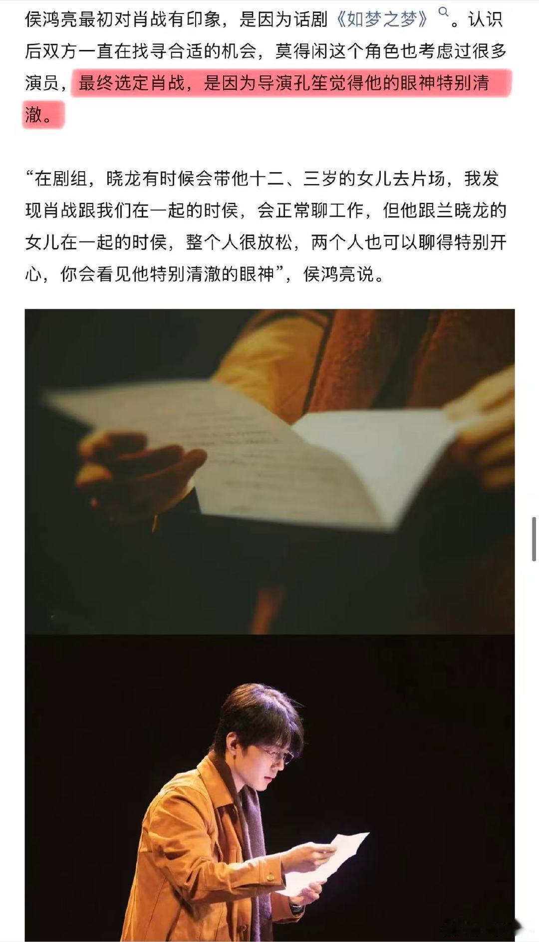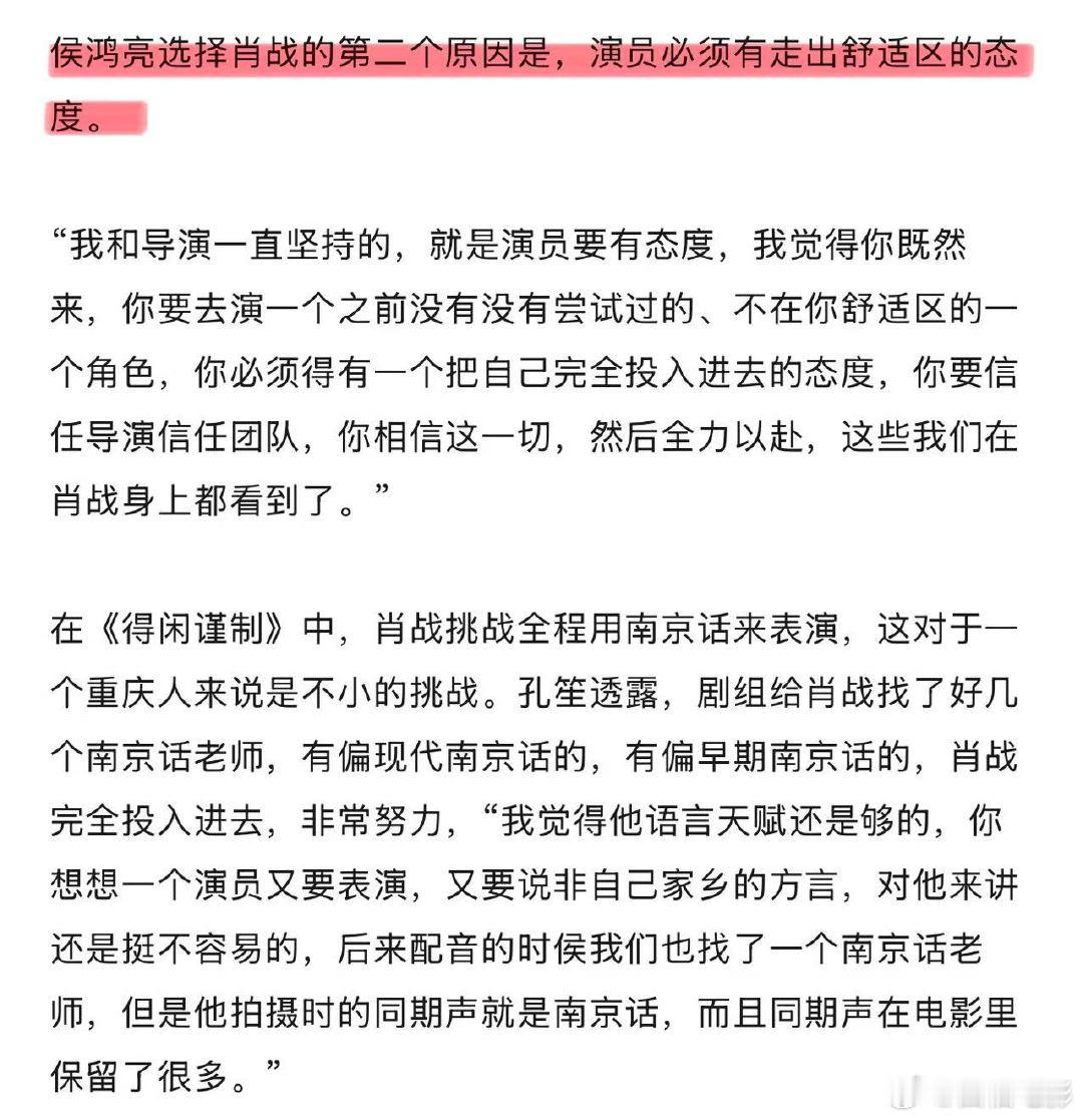 得闲谨制选择肖战的原因侯鸿亮对肖战的初印象是如梦之梦 《得闲谨制》导演、总制片人在采访中聊到《得闲谨制》选择的原因:眼神特别清澈、有走出舒适区的态度。采访中还提到,侯鸿亮对肖战的初印象是因为话剧《如梦之梦》。认识后双方一直在找寻合适的机会,莫得闲这个角色也考虑过很多演员,最终选定肖战。肖战辟谣为拍得闲谨制去工厂实习2个月