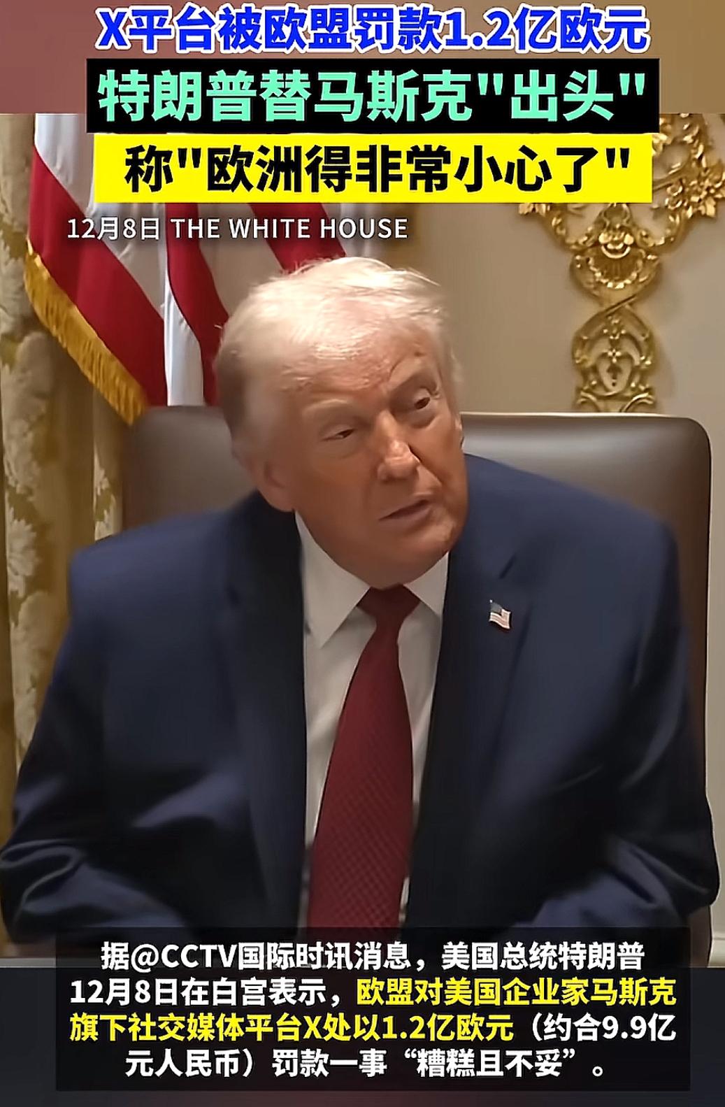 马斯克被欺负! 特朗普为其出头 据权威媒体12月5日报道,欧盟委员会当天正式给马斯克旗下的X平台开出1.2亿欧元罚单,这也是《数字服务法》生效后欧盟作出的首份“不合规决定”。 紧接着12月8日,特朗普在接受采访时,直言这笔罚款“糟糕且不妥”,还警告“欧洲必须非常谨慎,正走向错误的方向” ! 一场看似“大哥护小弟”的戏码,实则是美欧摆上台面的利益博弈。 说马斯克“被欺负”,其实是欧盟按规矩办事。 根据欧盟委员会公报,罚款拆分得明明白白: 4500万欧元针对付费即可获得的“蓝标认证”。 这种无需身份核验的设计被认定为“欺骗性设计”,容易误导用户遭遇诈骗 ; 3500万欧元源于广告资料库缺乏透明度,关键信息缺失导致无法核查虚假广告; 剩下4000万欧元则是因为X平台拒绝向合格研究人员开放公共数据。 美国国务卿鲁比奥、副总统万斯等高官,都跳出来指责欧盟“偏见”,但欧盟执行副主席明确回应,罚款只关乎透明度义务,与言论审查无关,金额和违规程度相当 。 特朗普的“出头”更像一场顺水人情的表演。 据路透社披露,特朗普自己都承认,马斯克压根没给他打电话求助 。 他此刻站出来喊话,一方面是借“护美企”刷热度,另一方面也延续了对欧盟的强硬姿态。 毕竟此前,白宫就已在国家安全战略报告中,批评欧洲盟友 。 但这声“警告”听听就行,美欧之间有3000亿美元贸易逆差,美国农产品离不开欧洲市场,欧盟汽车也需要美国消费者,真撕破脸谁都不划算 。 最无奈的还是这些科技巨头。 马斯克5日在X平台上大呼“废除欧盟”,可转头还得按要求整改。 欧盟明确规定,60天内要整改蓝标认证问题,90天内得完善广告库和数据开放机制,不然可能面临追加罚款。 这场景,像极了交“保护费”: 谷歌、苹果之前也因违反欧盟法规被罚,现在X平台步了后尘,明知肉疼也不敢退出5亿用户的欧洲市场 。 说到底,这就是权威规则框架下的利益拉扯。 欧盟拿法规立威还赚了罚款,特朗普刷了存在感,马斯克亏点儿小钱不影响大局,只有咱吃瓜群众,拿着权威报道当剧本,看得津津有味儿。 毕竟热闹是他们的,咱图个真实又有趣的乐呵就行。 外卖超时了你会给差评吗