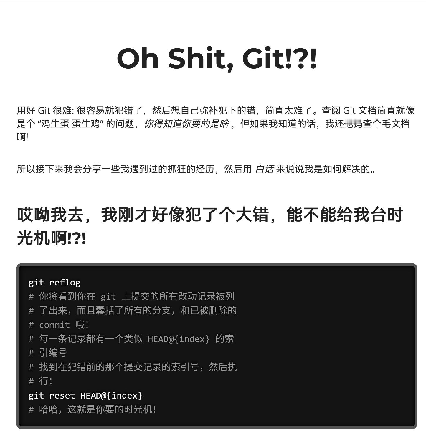 Oh Shit, Git!?!ohshitgit.com/zh-------------“用好 Git 很难: 很容易就犯错了,然后想自己弥补犯下的错,简直太难了。查阅 Git 文档简直就像是个 “鸡生蛋 蛋生鸡” 的问题,你得知道你要的是啥 ,但如果我知道的话,我还他妈查个毛文档啊!所以接下来我会分享一些我遇到过的抓狂的经历,然后用 白话 来说说我是如何解决的。”科技先锋官