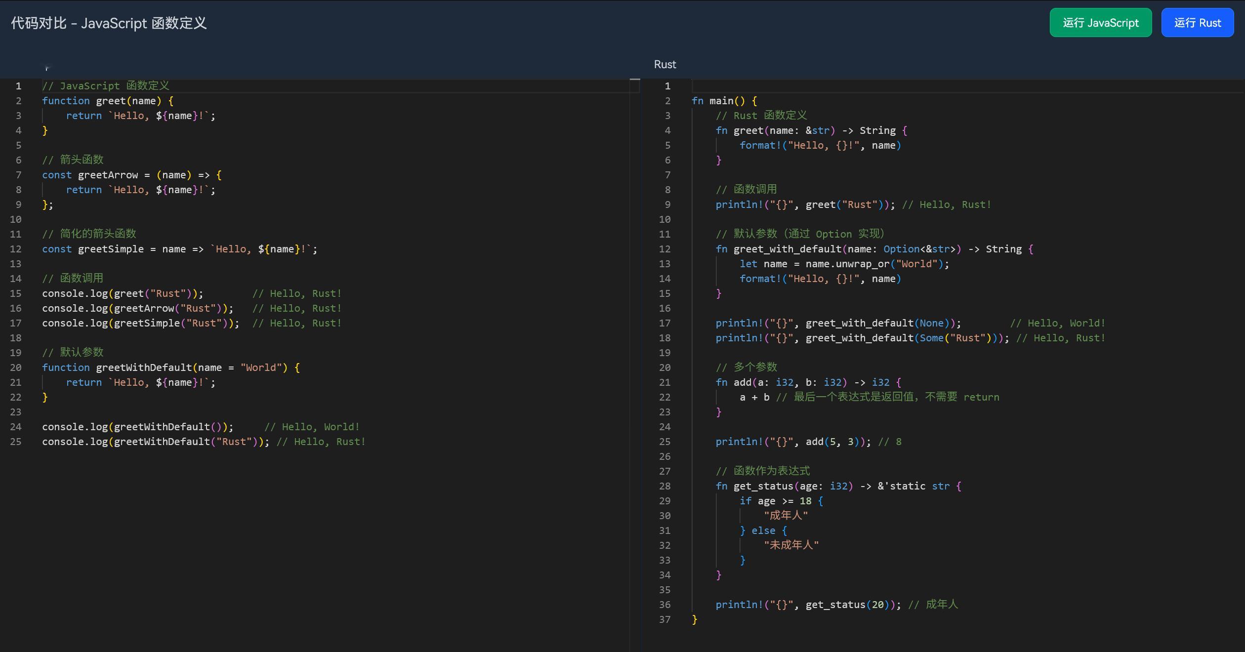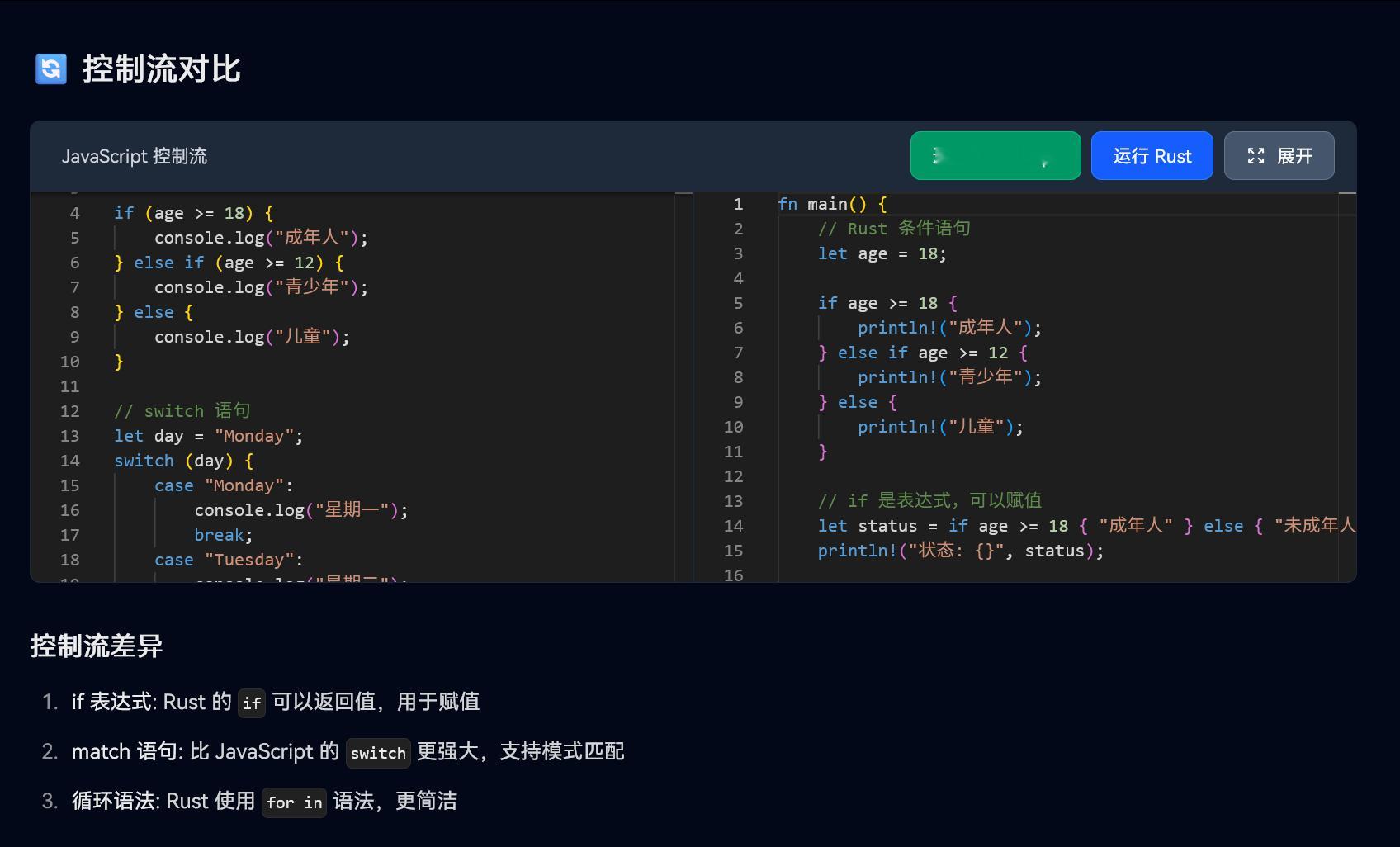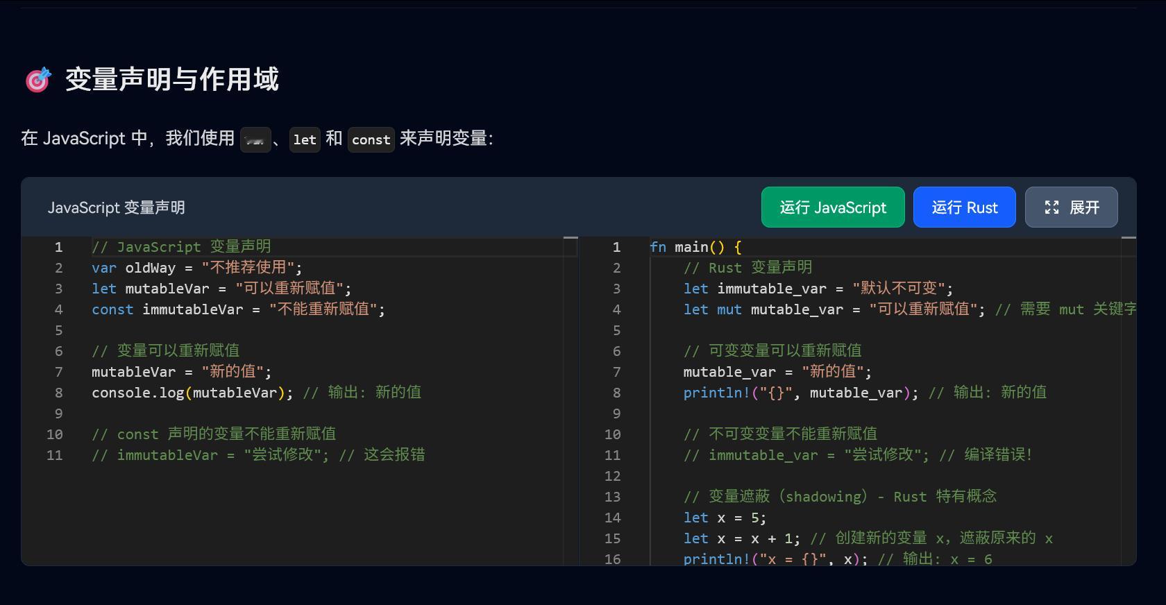 LangShift.dev这个网站(也是个开源项目 github.com/erweixin/langshift.dev )是个通过对比不同编程语言的语法特性和概念映射,帮助你快速理解新语言的核心概念,并能够将其应用到实际项目中。核心理念是:通过已知语言理解未知语言,让学习新编程语言变得简单高效。比如图中为已经会了JavaScript要学Rust的一个学习方法。科技先锋官