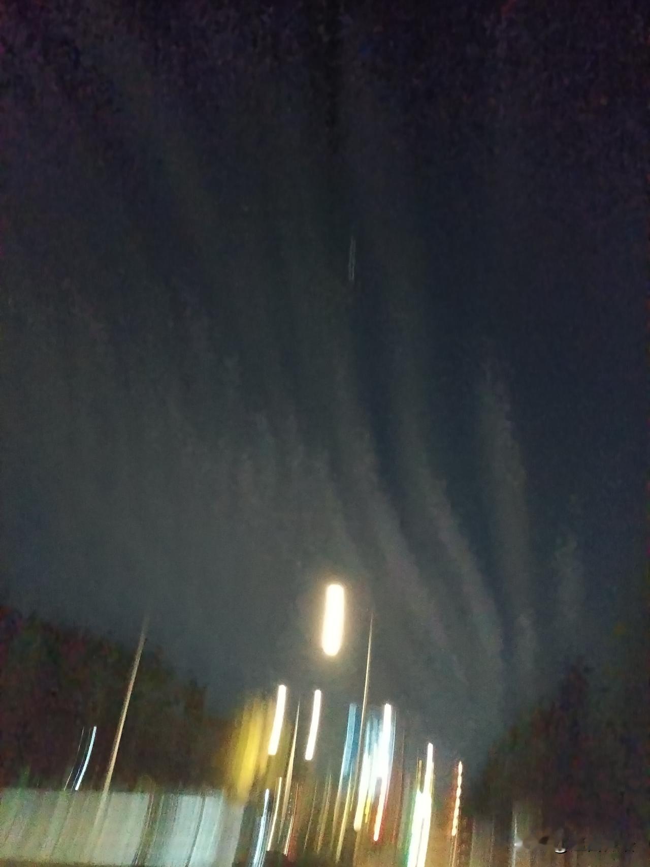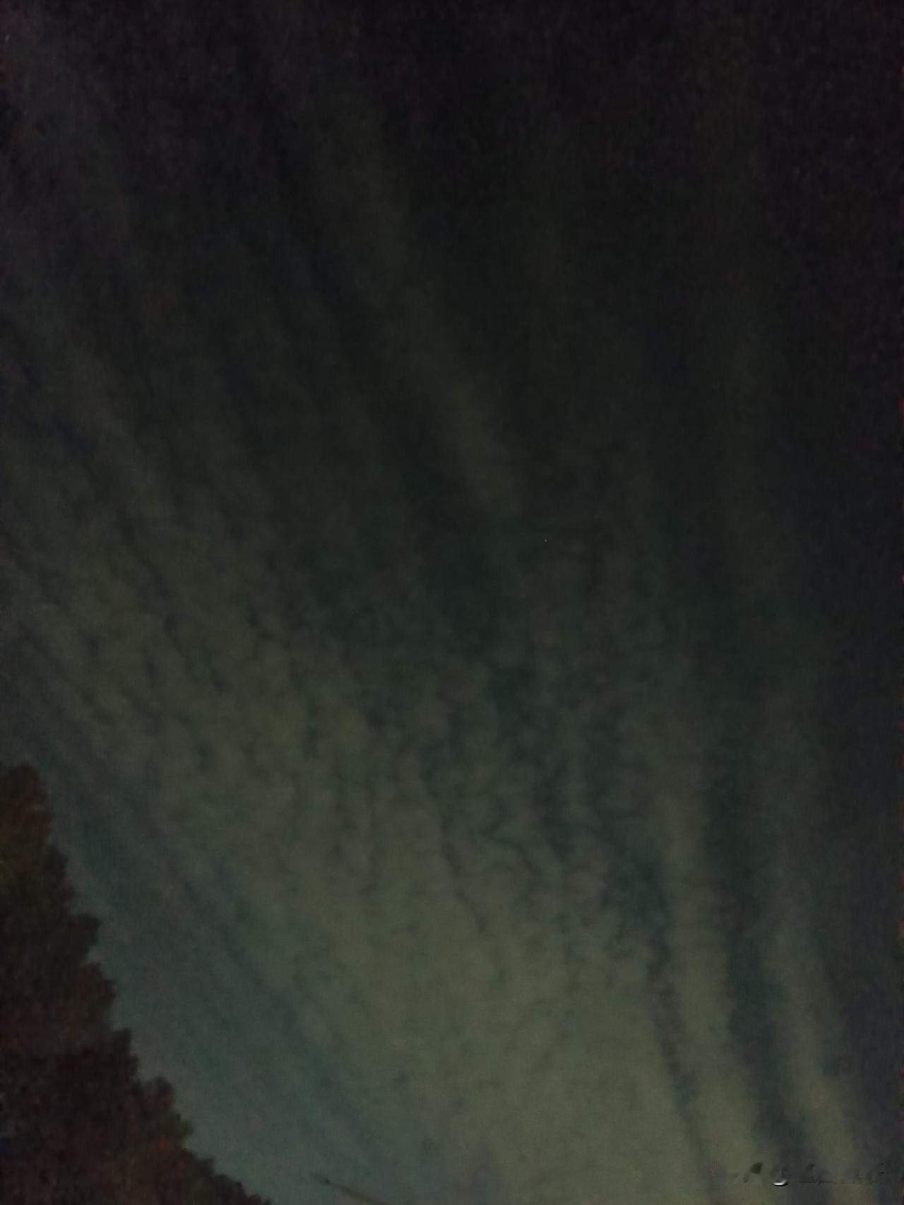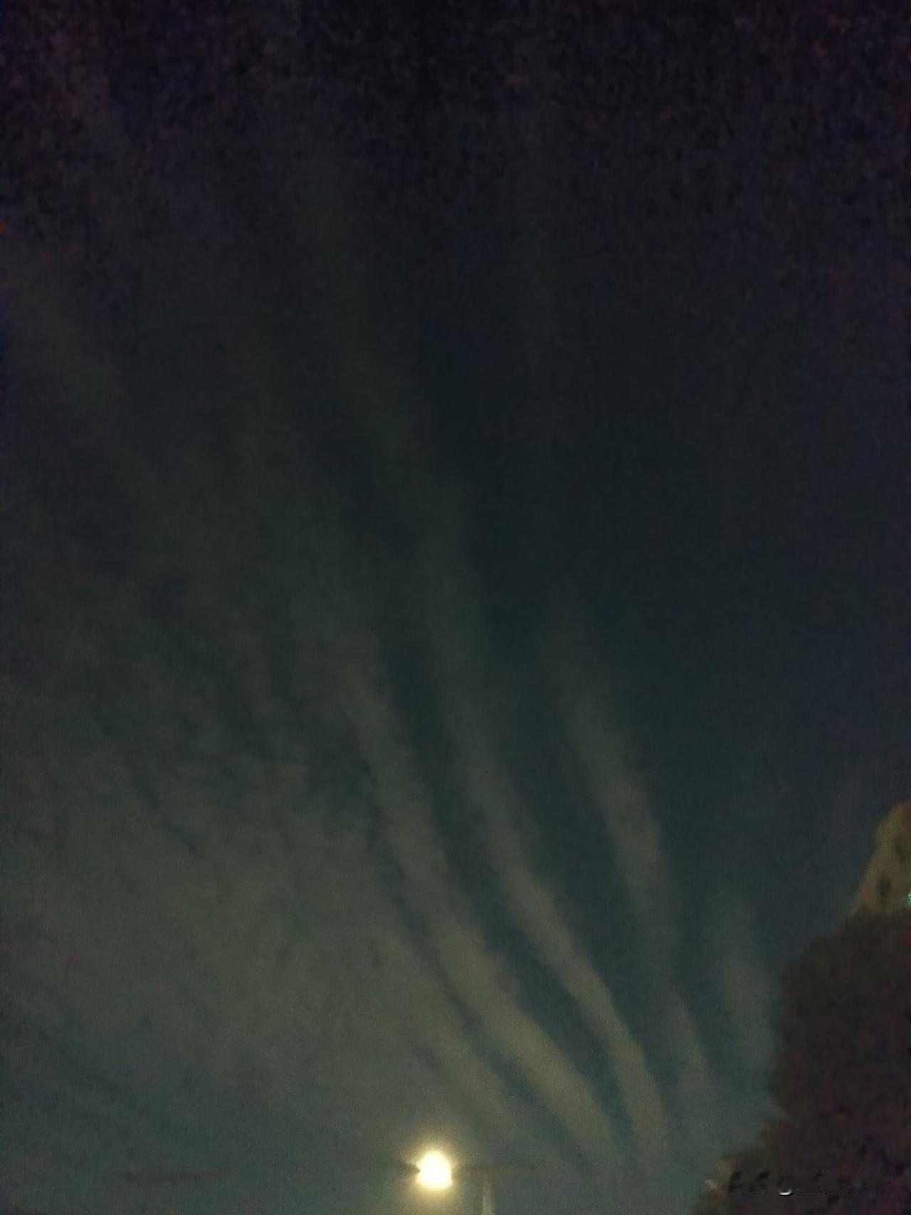 今晚的天空有点奇特啊 看这痕迹像是喷气式的杰作 但又像自然形成。 希望一切安好,