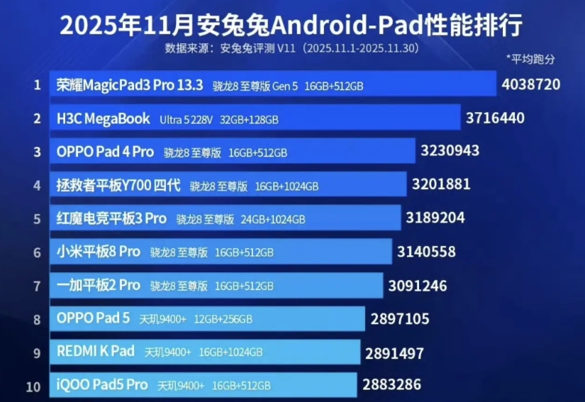 安兔兔霸榜! 荣耀MagicPad 3 Pro 以403万好成绩拿下安兔兔11月份安卓平板跑分第一名,属于是遥遥领先的状态