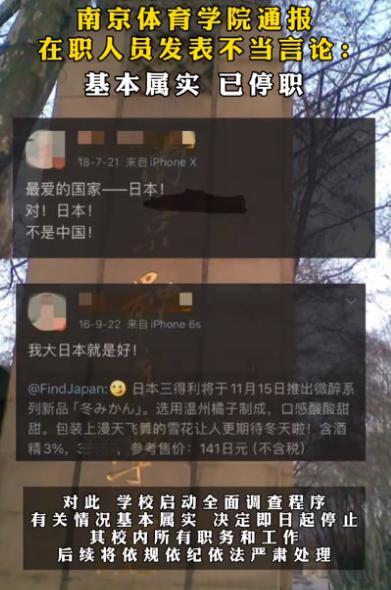 “丑陋的中国人,恶心的中国人,可惜我是中国人。”8月25日有网友发现微博上一名ID为“满目山河空念远”的博主,数年来多次在微博发布每日辱华言论,其身份曝光后,竟是南京体育学院的一名教师!学校得知后迅速做出的处理令众多网友大加称赞...... 如果你去翻南京体育学院的荣誉榜,可能会看到一个叫张某某的人,被学校评为“年度优秀个人”。 可你要是上网搜一下“满目山河空念远”这个账号,看到的东西完全是另一副面孔,那是一条从十多年前就开始的阴暗、恶毒、让人背脊发凉的网络记录。 要不是因为击剑部副主任袁某某出事,把她这个隐藏多年的“马甲号”顺带牵了出来,她估计还会继续在学校里若无其事地混着。 很难理解,一个39岁、读过硕士、家在南京、本来该是个稳定体制内岗位的副科长,竟然能做到“吃着这片土地的饭,却在网上骂得最狠”。 她拿着国家给的工资,享受着学校的福利,可转头就在网上对自己的同胞破口大骂,什么“丑”“恶心”“素质差”……最狠毒的词她都用得下去。 甚至在全国都为神舟九号上天欢呼的时候,她一句“真心不觉得伟大”冷冰冰地敲出来,让人都不知道她心到底是怎么长的。 她网上的恶毒不是偶然发几句气,而是像长期积累的怨气一样,动不动就往外喷,坐地铁看到有人不文明,她不是简单抱怨,而是直接咒人“该毒死”、“长满疮”。 这话从谁嘴里说出来都吓人,但从一个在高校混饭吃的人嘴里说出来,更是让人反胃,别说什么榜样,大人该有的底线都没了。 要说光是骂同胞还只是刻薄,那她对日本的那股“上头劲”,就不是普通的喜欢,已经到了“疯狂迷恋”的程度了。 日本哪怕出一个饮料,她都能激动得像中了奖似的夸“大日本就是好”,她的社交主页里满是“我要去日本”“不移民会死”“我爱日本”这种话,看着就让人觉得别扭。 更讽刺的是,这些东西不是她某一天心情不好发的,而是从好多年前就开始持续不断地发,可见这想法早就根深蒂固了。 再往她家里看看,似乎也不是她一个人的问题,外婆人在美国还特意买日本泡面,母亲和干妈更是逢日就夸,恨不得马上移民。 虽然有迹象显示她爷爷可能参加过渡江战役,是实打实为国家拼过命的人,可到了孙女这里却彻底走了样,祖辈流的血完全没换来她应有的尊重。 而真正让人寒心的,是她对历史伤口的不敬。 她生活在南京,这是一座带着沉重记忆的城市,可她偏偏在2015年9月3日:抗战胜利70周年纪念日那天,发文嘲笑南京大屠杀公祭活动上领舞“演得太过”。 一个每天踩在这片土地上的人,对逝者连起码的敬意都没有,不但冷漠,还要拿出来嘲笑,这种行为比无知更可怕,是心里坏到根里了。 她之所以被发现,是因为网友顺着袁某某的社交关系一点点查,才把她这个藏得更深的“精日”马甲扒出来。 铁证摆在那儿,加上舆论暴涨,南京体育学院的处理速度可以说相当果断,事件发酵才两天不到,学校就公布停职并展开全面调查,没有拖泥带水。 一个教育工作者的价值观,直接关系到他们会影响怎样的学生,一个心里装着仇恨、厌恶祖国、崇洋到变态的人留在校园里,轻则误导学生,重则造成意识形态风险。 学校这次的停职,不只是惩治一个人,更是向所有人表明:教育岗位必须有人品、有底线,不然就不能待在那。 对此你怎么看? 信源:澎湃新闻