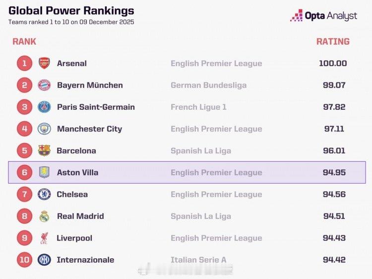 Opta俱乐部竞技实力实时排名:1-阿森纳——1002-拜仁——99.073-巴黎——97.824-曼城——97.115-巴萨——96.016-维拉——94.957-切尔西——94.568-皇马——94.519-利物浦——94.4310-国米——94.42 英超联赛 阿森纳著名教授