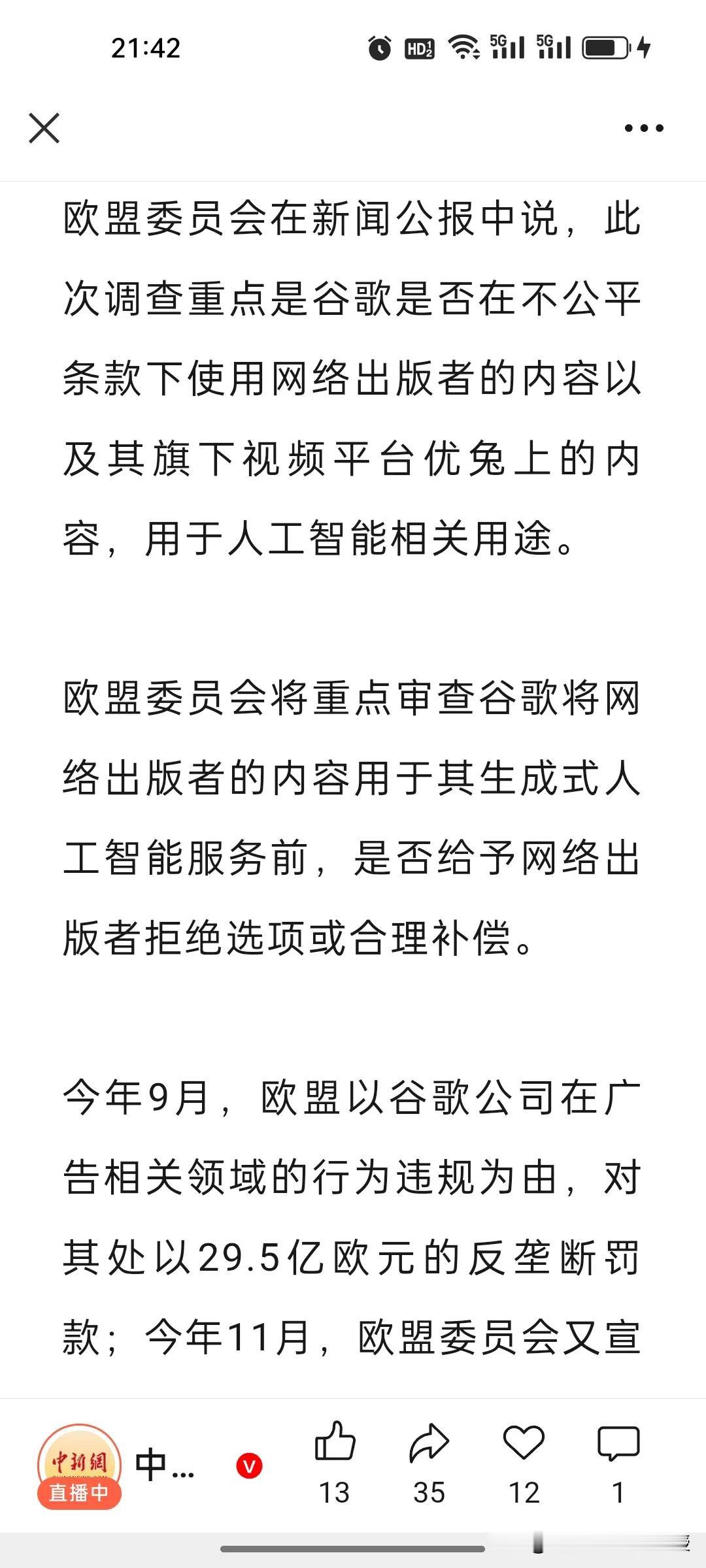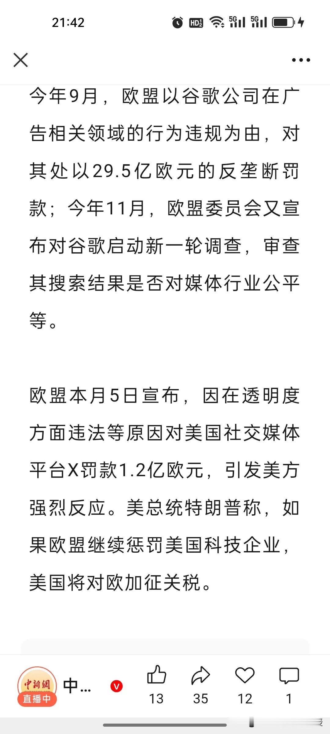 欧盟这次真的跟美国彻底杠上了!刚刚,根据《中国新闻网》最新消息,欧盟宣布调查谷歌,欧盟的《数字服务法案》又在“冲锋陷阵”,将美国科技巨头一一“宰割”,谷歌真的是“冤大头”,至今已经被欧盟罚了82.5亿欧元,今年早些时候和Meta也被被罚了36.5亿欧元。马斯克的X平台最近也被罚了1.2亿欧元,马斯克气的直呼要“废除欧盟”。 特朗普政府则表态,如果欧盟还是惩罚美国企业,那么对欧洲征税是少不了的。 但是,欧盟并没有退缩,还越战越勇,一副死磕到底的态势,今天还是官宣了新一轮对谷歌的调查,审查其搜索结果是否对媒体行业公平。看看特朗普会不会即日启动对欧盟的报复性关税了!毕竟如今的欧洲已经在白宫最新发布的美国《国家安全战略》中被边缘化了。