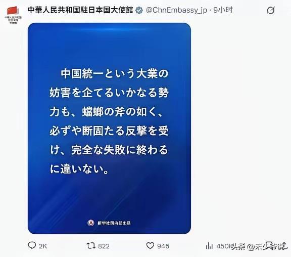 日本舆论崩溃,地震期间驻日使馆发螳臂挡车海报 今天我国驻日使馆发了一张海报内容为“任何势力胆敢阻挠中国统一大业,都是痴心妄想、螳臂挡车,注定失败!” 然而就是这张海报让日本舆论彻底奔溃,以往日本出现地震等灾难的时候中国都会予以慰问和支援,此次中国没有慰问和支援而是发了一张螳臂挡车的海报,可见中日之间局势的紧张程度。 而更令日本舆论崩溃得是在地震之前中国歼15战斗机雷达照射了F15,这基本是开火的前兆。日本舆论现在都害怕有更大的地震同时也害怕中国打过来。