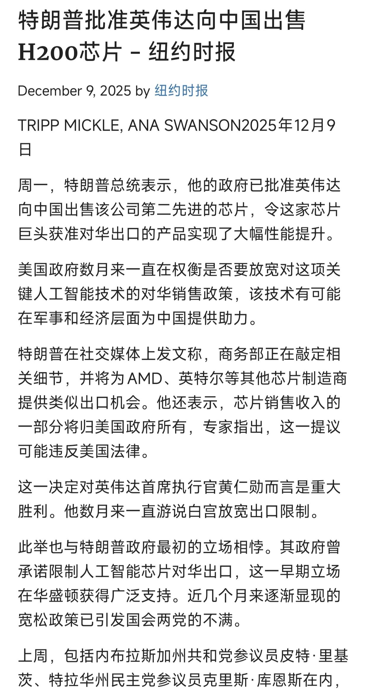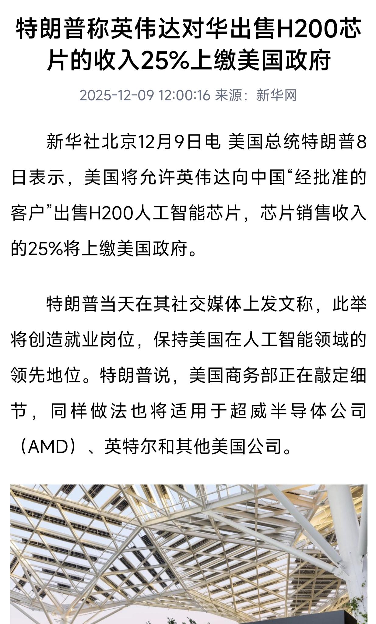 特朗普批准英伟达向中国出口H200芯片,但要将其收入的25%上缴美国政府!