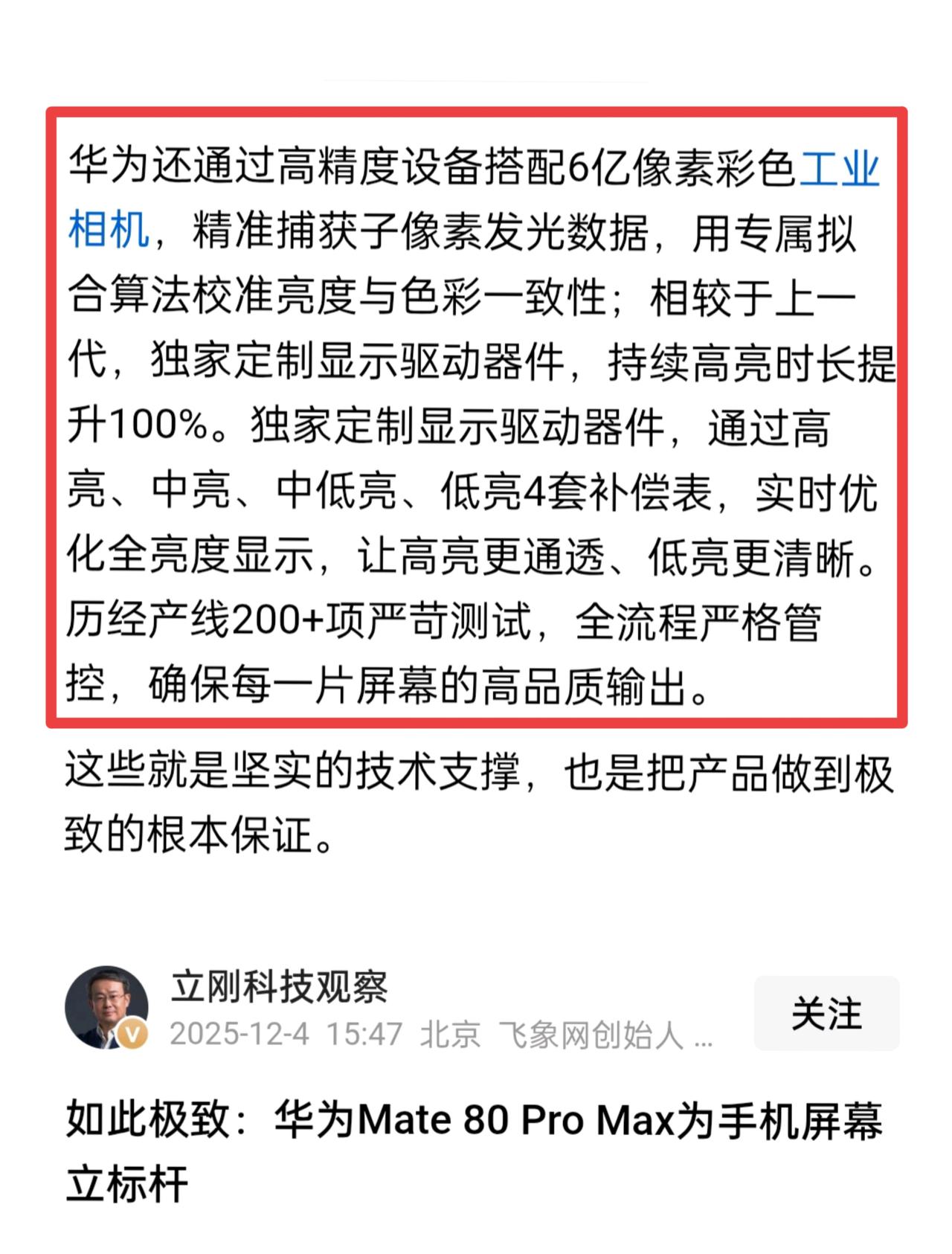 项立刚谈华为Mate80 Pro Max的高像素彩色相机。 12月,项立刚先生发文称,华为Mate80 Pro Max手机的像素达到了六亿。在出厂前,手机里面的驱动器件经过了200多项的严苛测试。项立刚认为,华为这是把产品做到了极限。 这就是搭载鸿蒙6系统的手机硬件配置之一。 此外,鸿蒙系统下的华为视频也是值得一说的,华为视频里面有一模块叫“华为影像”,这应该是用华为的设备来拍摄的。在2025年,有一视频名叫《洼洼地里好庄稼》,这部纪录片展现了农村生活的景象,给人一种舒适、真实的感觉。 鸿蒙系统真的改变了人们的生活!