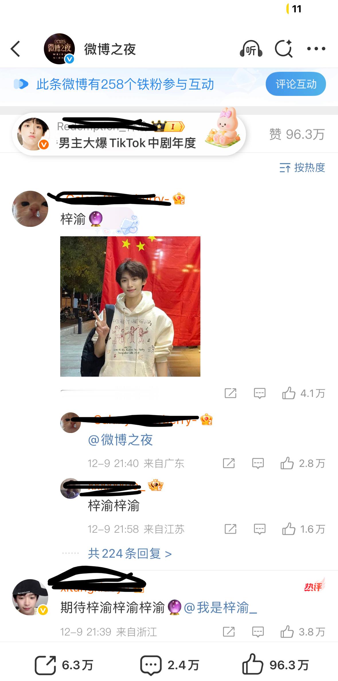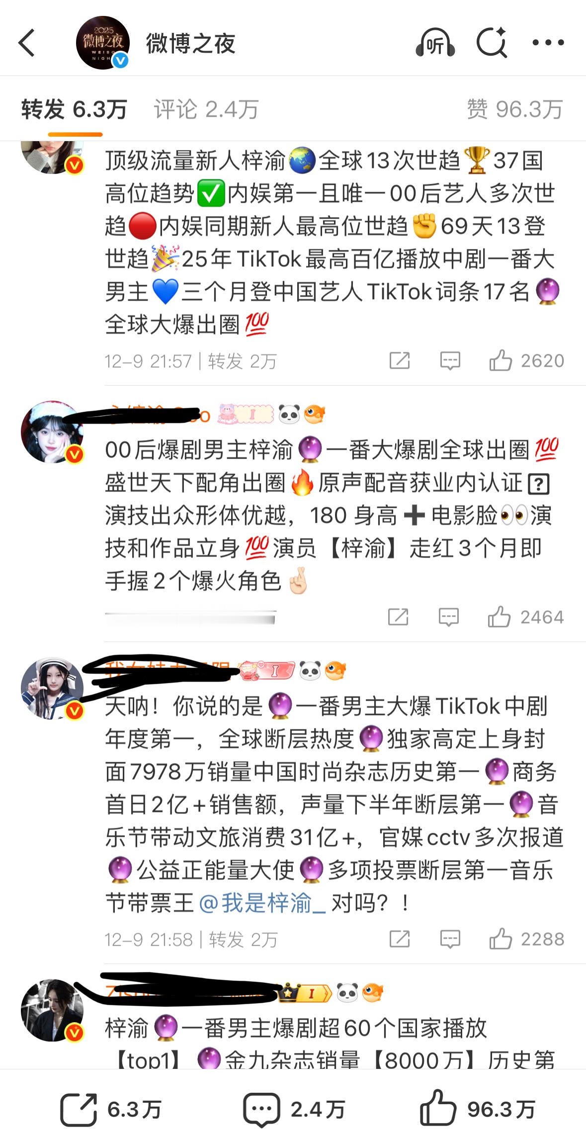 梓渝粉丝把微博之夜前排和转发区全占满了顶流来了