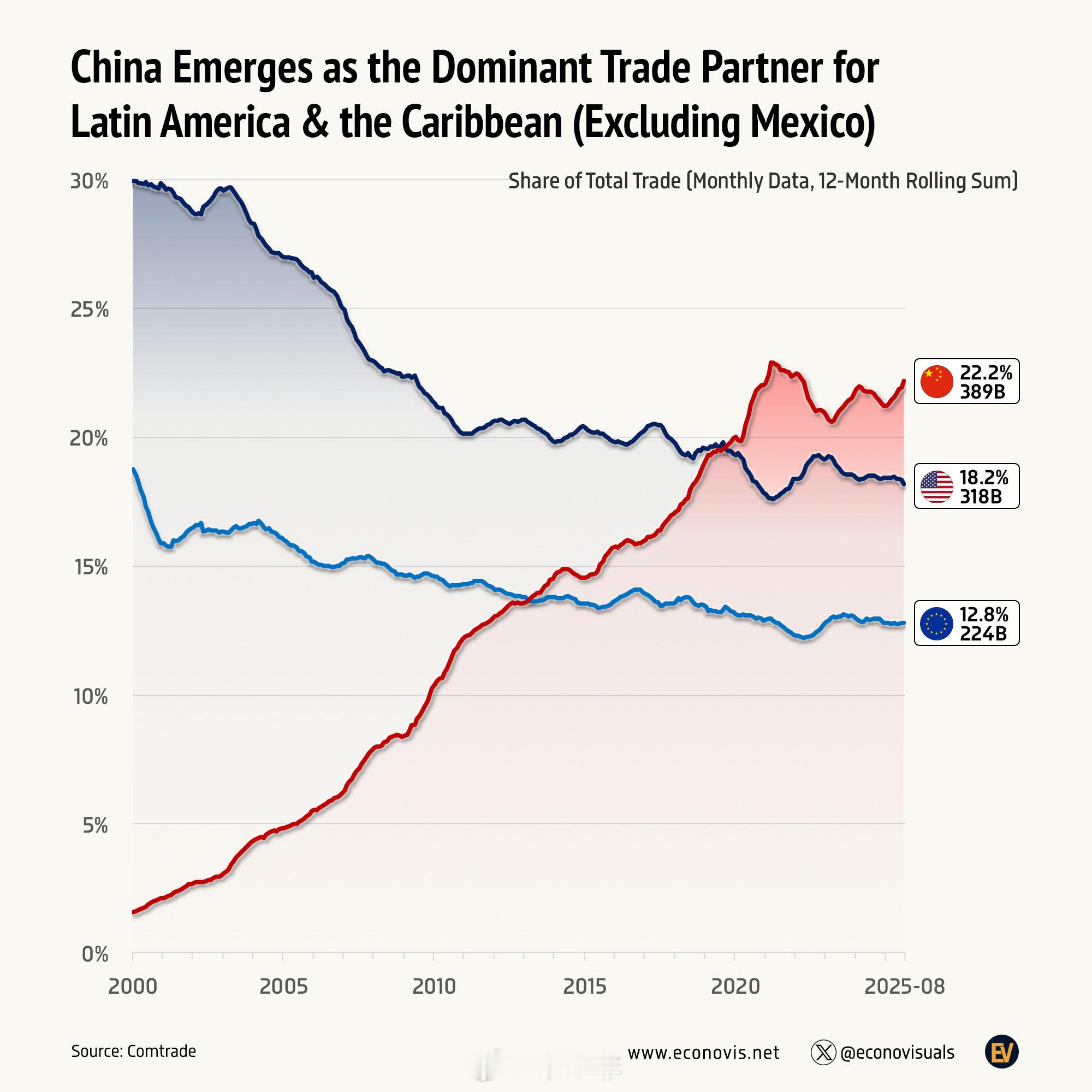 📈中国成为拉丁美洲和加勒比地区(不包括墨西哥)的主要贸易伙伴 截至 2025 年 8 月的十二个月内,中国占拉丁美洲和加勒比地区(不包括墨西哥)贸易额的 22.2%,超过了美国(18.2 %)和欧盟(12.8 %) 。 LatinAmerica老常政经