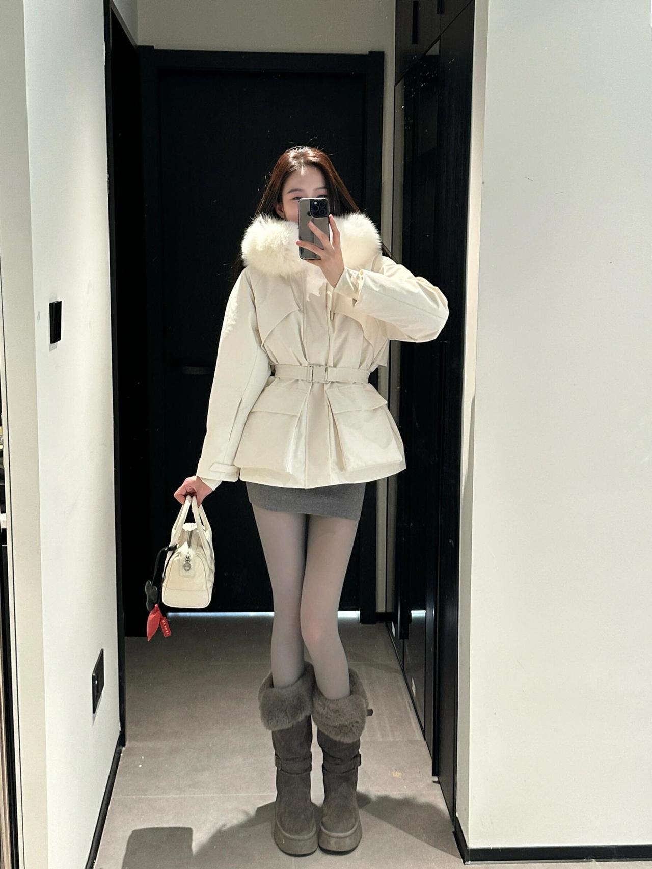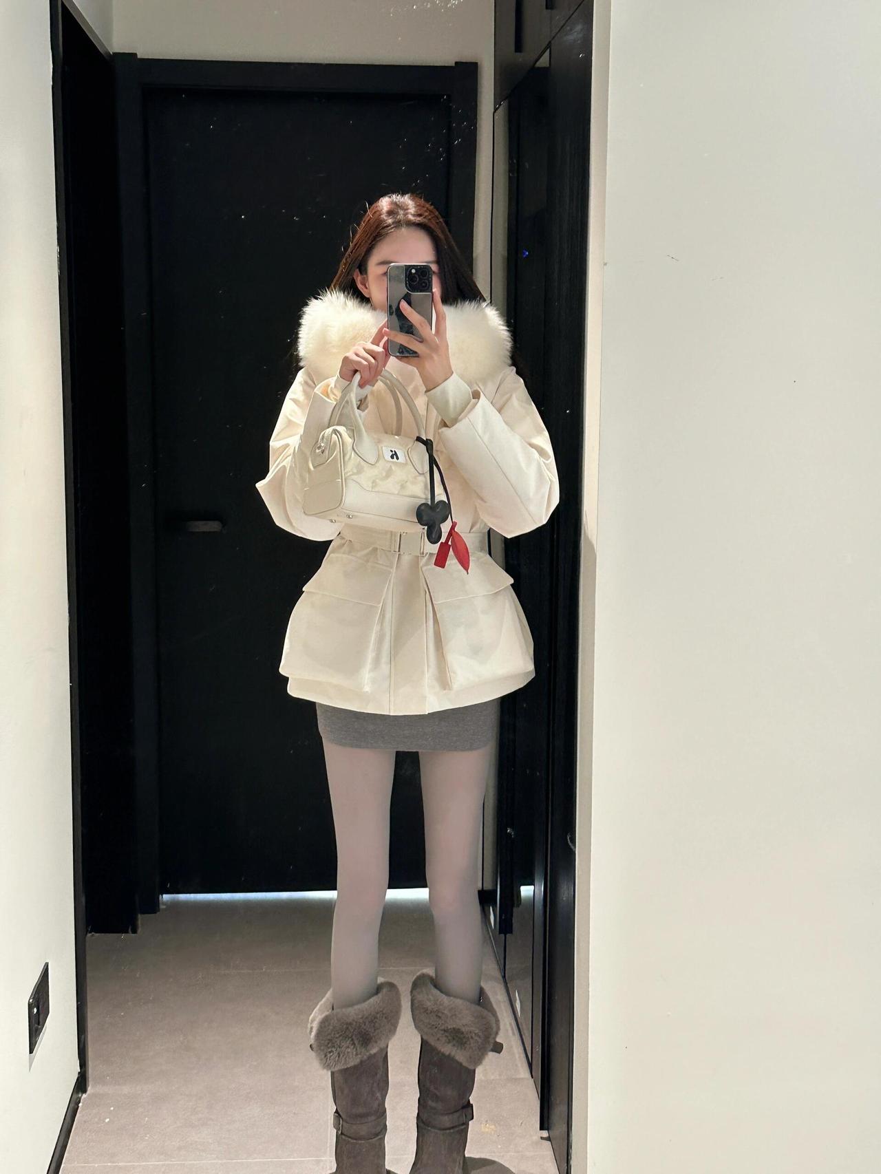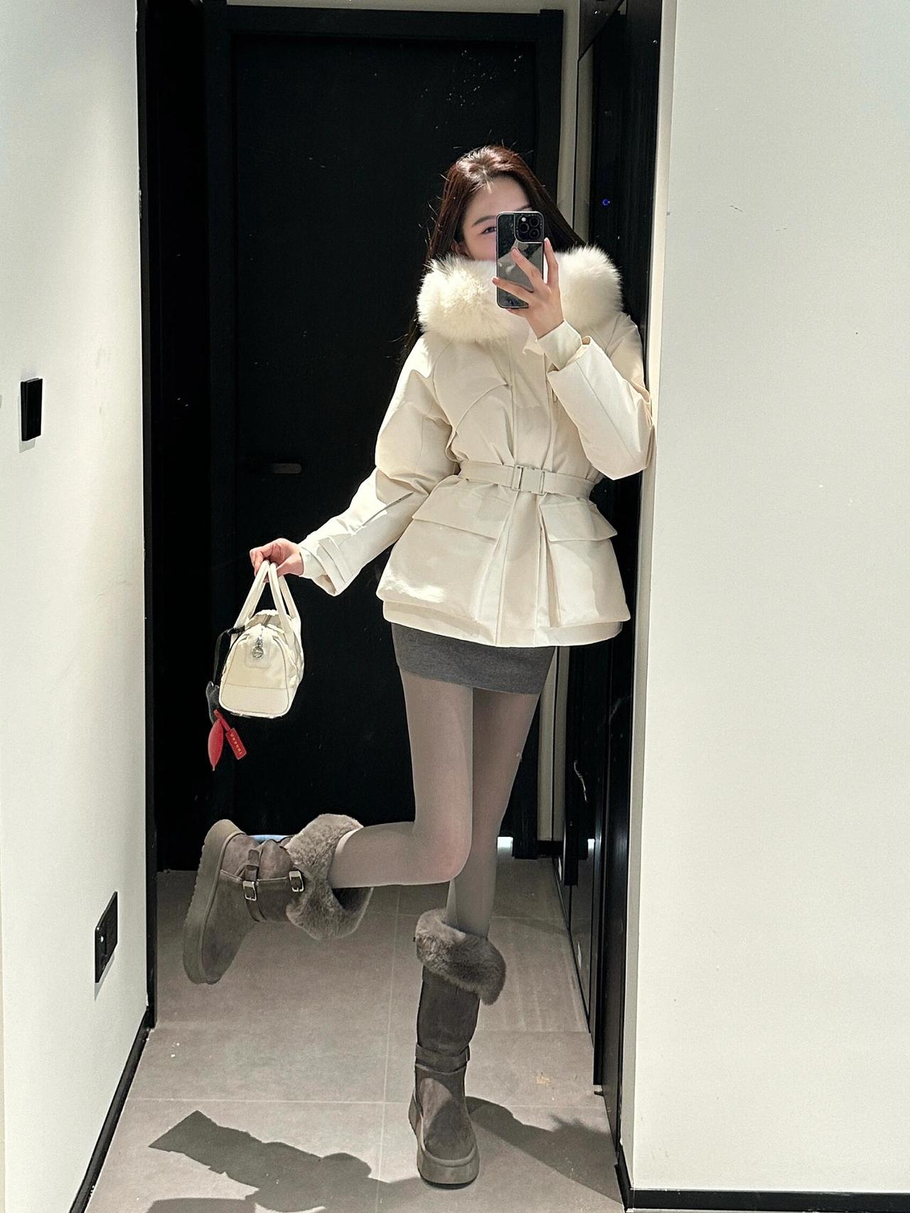 今日穿搭是冬日温柔轻熟风,整体搭配兼顾保暖与精致感: 上衣:米白色带毛领收腰棉服,毛领增加冬日氛围感,收腰设计修饰身材,避免臃肿; 下装:浅灰色短款包臀裙+灰色打底裤,弱化厚重感,增添轻盈精致度; 配饰:同色系迷你手提包+毛边厚底雪地靴,既呼应了整体色调,又提升了保暖性。 适合场合: 日常通勤、逛街、约会、轻社交场合,保暖又不失精致感。