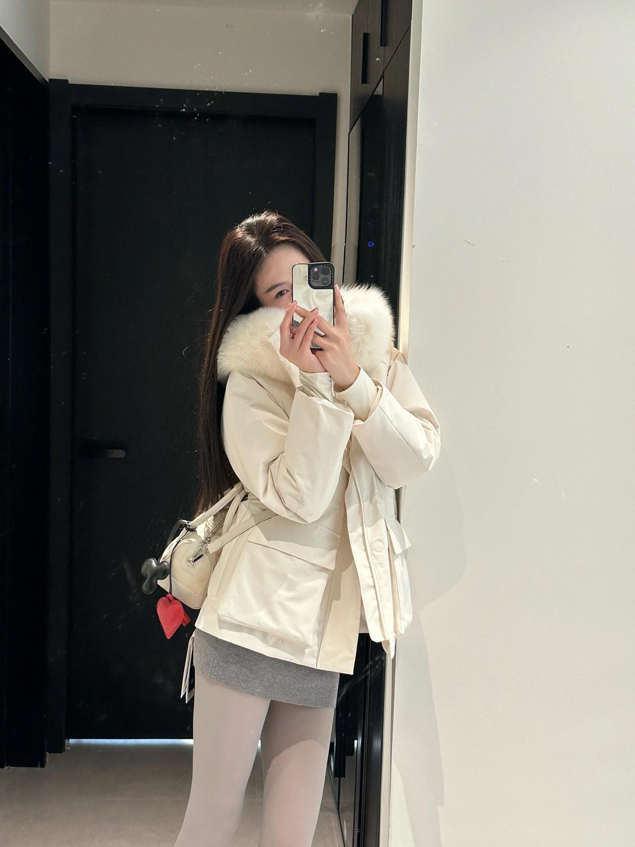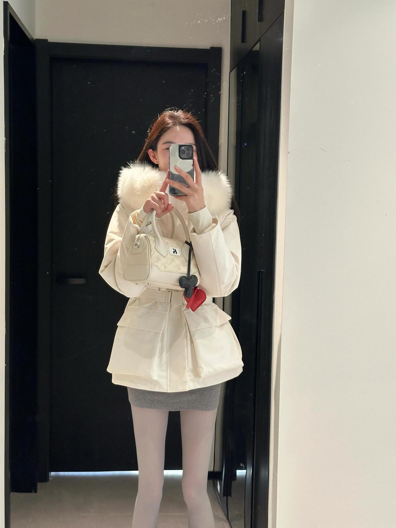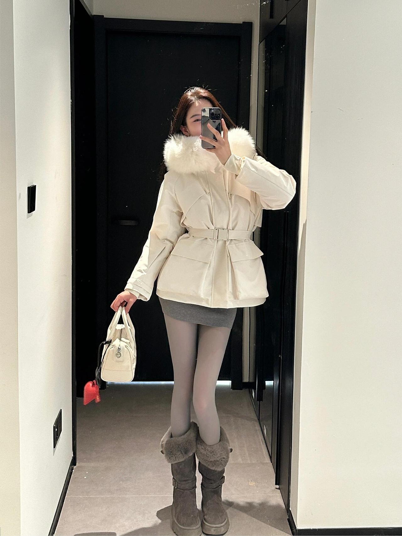 今日穿搭是冬日温柔轻熟风,整体搭配兼顾保暖与精致感: 上衣:米白色带毛领收腰棉服,毛领增加冬日氛围感,收腰设计修饰身材,避免臃肿; 下装:浅灰色短款包臀裙+灰色打底裤,弱化厚重感,增添轻盈精致度; 配饰:同色系迷你手提包+毛边厚底雪地靴,既呼应了整体色调,又提升了保暖性。 适合场合: 日常通勤、逛街、约会、轻社交场合,保暖又不失精致感。