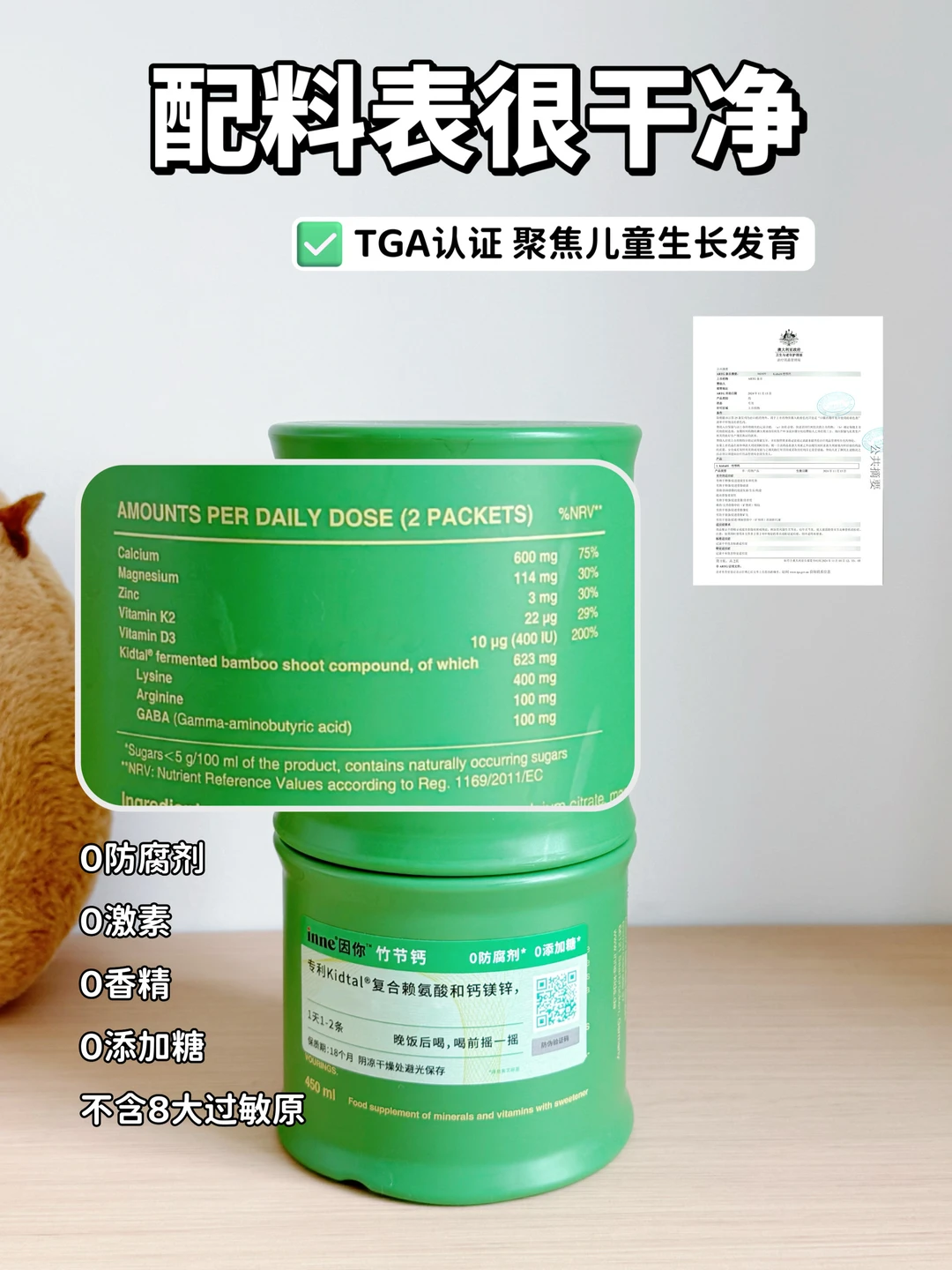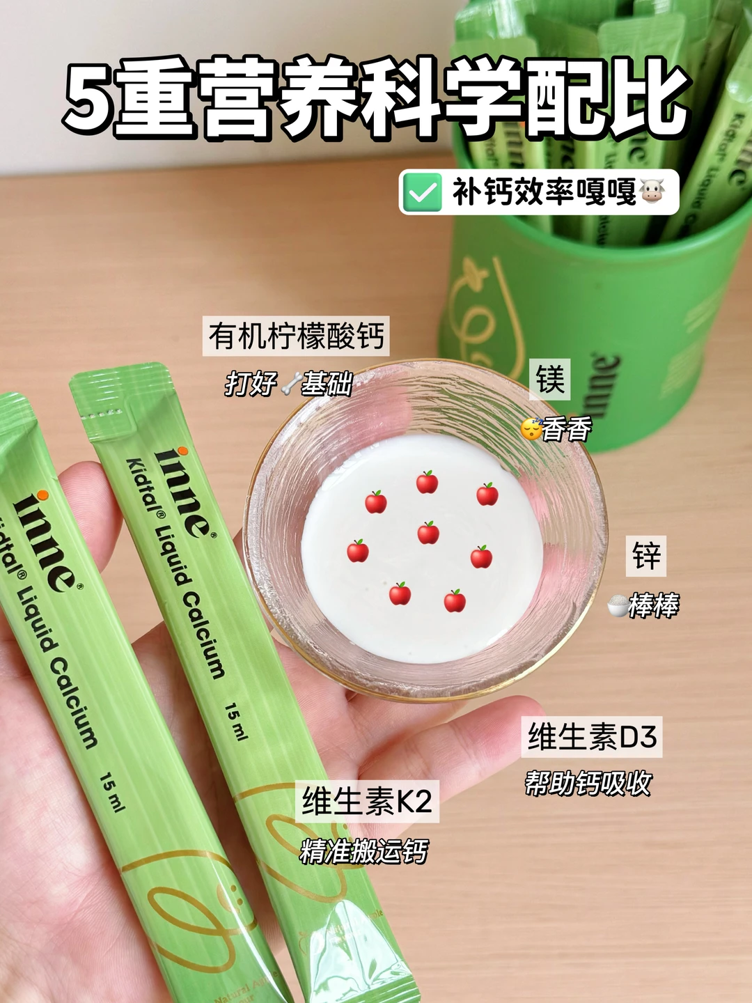 除了赖氨酸,inne的其他搭配成分也很科学,300mg钙+镁锌D3K2,他们帮孩子提高钙吸收,关键钙源还是有机柠檬酸钙,不用担心吃了不吸收的问题,而且苹果味🍏的液体钙,孩子爱吃,酸酸甜甜的适合夏天!我家哥哥以前吃钙片三天打鱼两天晒网,现在放学就追着我要喝,咕嘟几口就干完,老母亲狂喜🥰配料表也干净!0激素0防腐剂0添加糖不含8大过敏原,换牙时喝也不担心蛀牙!