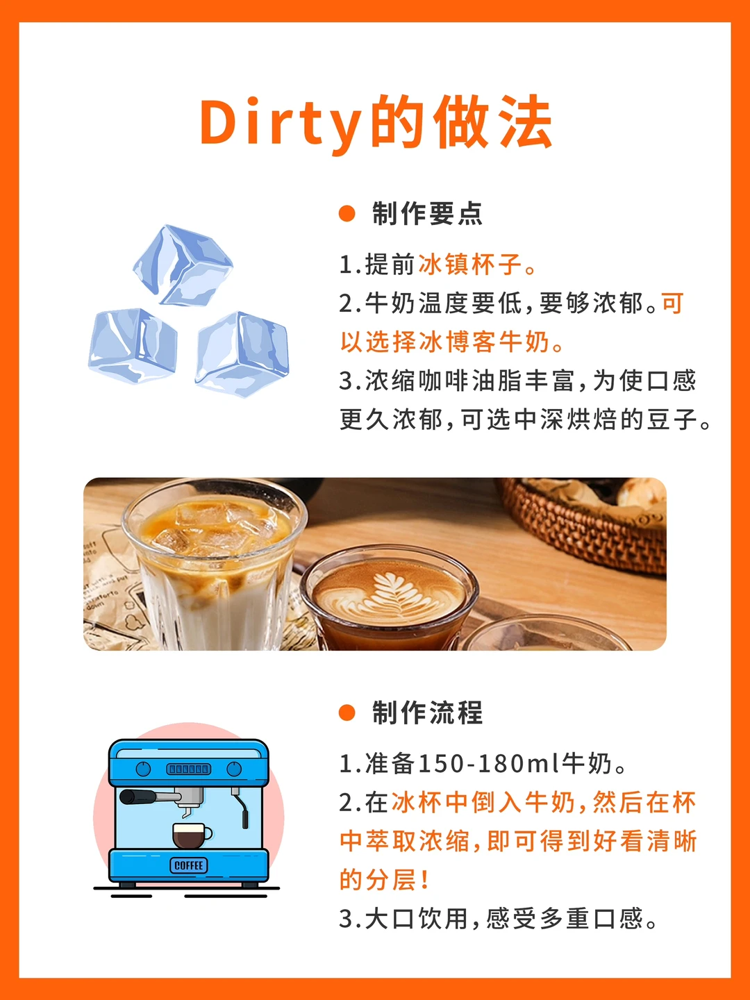 为了让Dirty口感更粘稠,现在通常会直接使用冰博客克牛奶。 当浓缩咖啡浇在牛奶表面的时候,渗透会比较慢,这就形成了分层。而品尝Dirty,品尝的就是这种分层带来的特殊口感。 出品后,不仅要尽快喝,而且要一下喝上一大口,将上层咖啡和下层牛奶同时包裹入口,冰火两重天在口腔交融,咖啡的苦和牛奶的甜汇聚在口腔,这种感觉才是真正属于Dirty咖啡的感觉