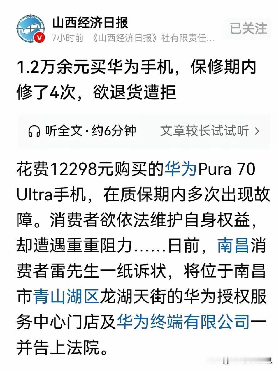 江西南昌,男子花12298元买了一部华为手机,使用一年后,手机出现卡顿、死机、暗屏多个问题。男子将手机送到服务中心维修,多次维修后始终没解决问题。男子对品牌失去信心,质保期内要求退换机,被拒后,将对方告上法庭,要求赔偿12298元购机款,以及精神损失费1元。最终,对方给雷先生全额退款12298元,又给了8000元的慰问金。 网友评论: 想当年买的Mate 7使用了一年半,出现死机无法开机,拿到售后检测为主板烧了,更换主板要1800多元。当时气的不行,直接把华为手机摔了。以后从不买此手机。 该组织的范文虽然洋洋洒洒,似乎是有凭有据,实际漏洞百出,华为P系列手机没有12999元这个价位的,国家的三包规定一年后是付费维修,不存在包退。该范文随意篡改国家的法律。 我从来不喜欢国产手机,即使是华为,我喜欢有真正质量实力的三星,苹果手机,不管是屏幕等,都是一流的,买其他品牌可以说是智商税。 把店长撤了,说明店长没有公关危机处理意识,更没有预判之后会给品牌带来什么样的影响,结果是手机退了,还赔了钱,还在社会上造成不良影响,这样的人放在管理岗是不合适的。
