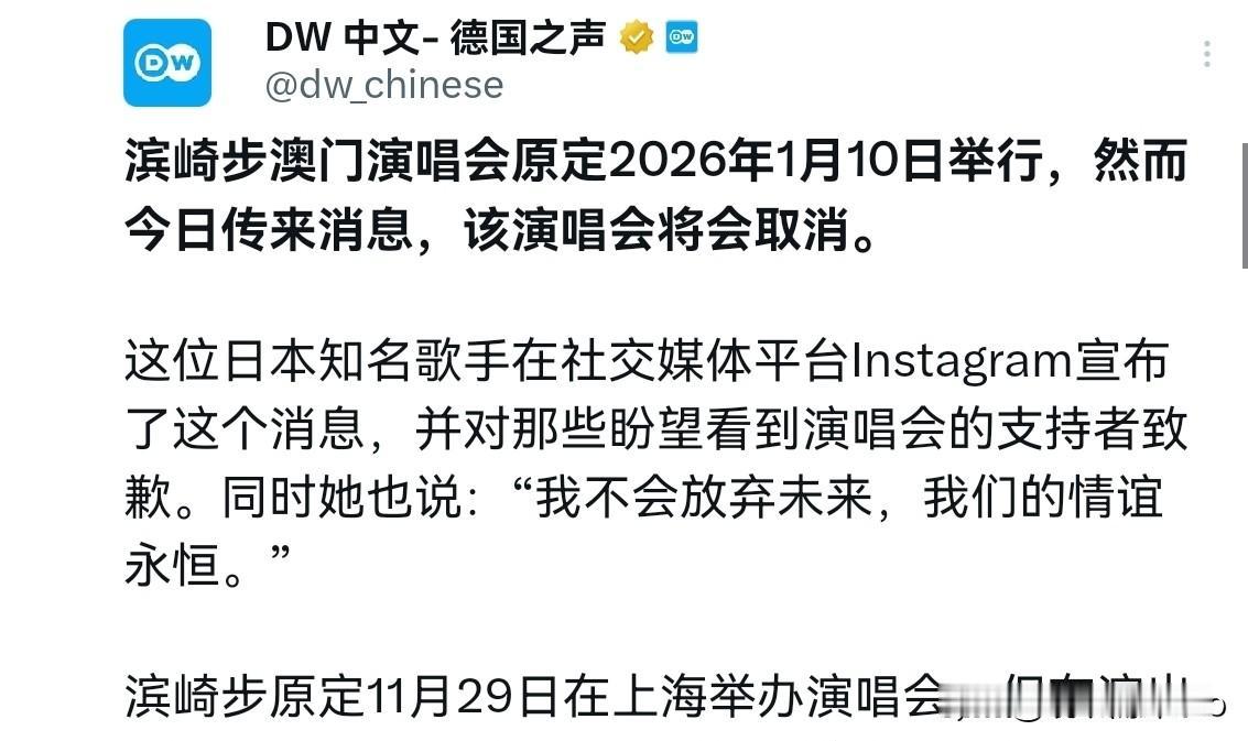 该叫停就叫停!这一次出手非常到位!12月9日,根据德国之声报道,在继上海叫停滨崎步的演唱会之后,滨崎步原定2026年1月10日在澳门举行的演唱会也被叫停。德媒称,日本首相高市早苗涉台言论导致中日两国关系紧张,除了滨崎步之外,还有多名日本艺人在中国的演出活动受到影响。而滨崎步本人则表示,我不会放弃未来,我们的情谊永恒。 滨崎步演唱会被叫停,这当然与当下的中日关系有某种关联。但是,更为重要的是,在中日关系的敏感期,滨崎步本人未进行任何的政治表态。滨崎步事实上一直没有表态支持一个中国原则,公开承认台湾是中国的一部分。很显然,滨崎步的沉默不是偶然,而明显是其本人及团队决定的结果。 从我们的角度而言,在中国市场赚钱,最基本的一条就是理解和支持中国的核心利益,滨崎步作为亚洲有影响力的艺人,对于这一规则毫无疑问是心知肚明的。而眼下事实上就有多个日本艺人团体公开表态支持中国政府的主张,这些日本艺人的演出也没有受到丝毫的影响。很显然,我们并没有进行一刀切,叫停所有日本艺人在华演出。但对于那些态度暧昧的日本艺人,我们的主办单位当然有必要表明自己的态度,而这个结果就是滨崎步自己选择的。