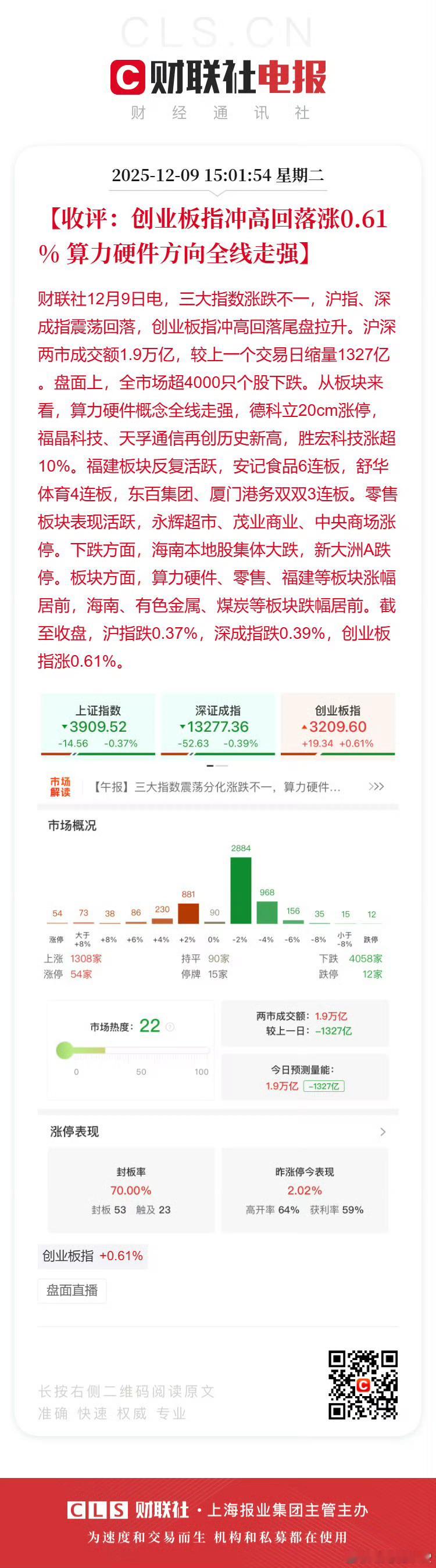 【收评:创业板指冲高回落涨0.61%算力硬件方向全线走强】财联社12月9日电,三大指数涨跌不一,沪指、深成指震荡回落,创业板指冲高回落尾盘拉升。沪深两市成交额1.9万亿,较上一个交易日缩量1327亿。盘面上,全市场超4000只个股下跌。从板块来看,算力硬件概念全线走强,德科立20cm涨停,福晶科技、天孚通信再创历史新高,胜宏科技涨超10%。福建板块反复活跃,安记食品6连板,舒华体育4连板,东百集团、厦门港务双双3连板。零售板块表现活跃,永辉超市、茂业商业、中央商场涨停。下跌方面,海南本地股集体大跌,新大洲A跌停。板块方面,算力硬件、零售、福建等板块涨幅居前,海南、有色金属、煤炭等板块跌幅居前。截至收盘,沪指跌0.37%,深成指跌0.39%,创业板指涨0.61%。A股A股盘面直播