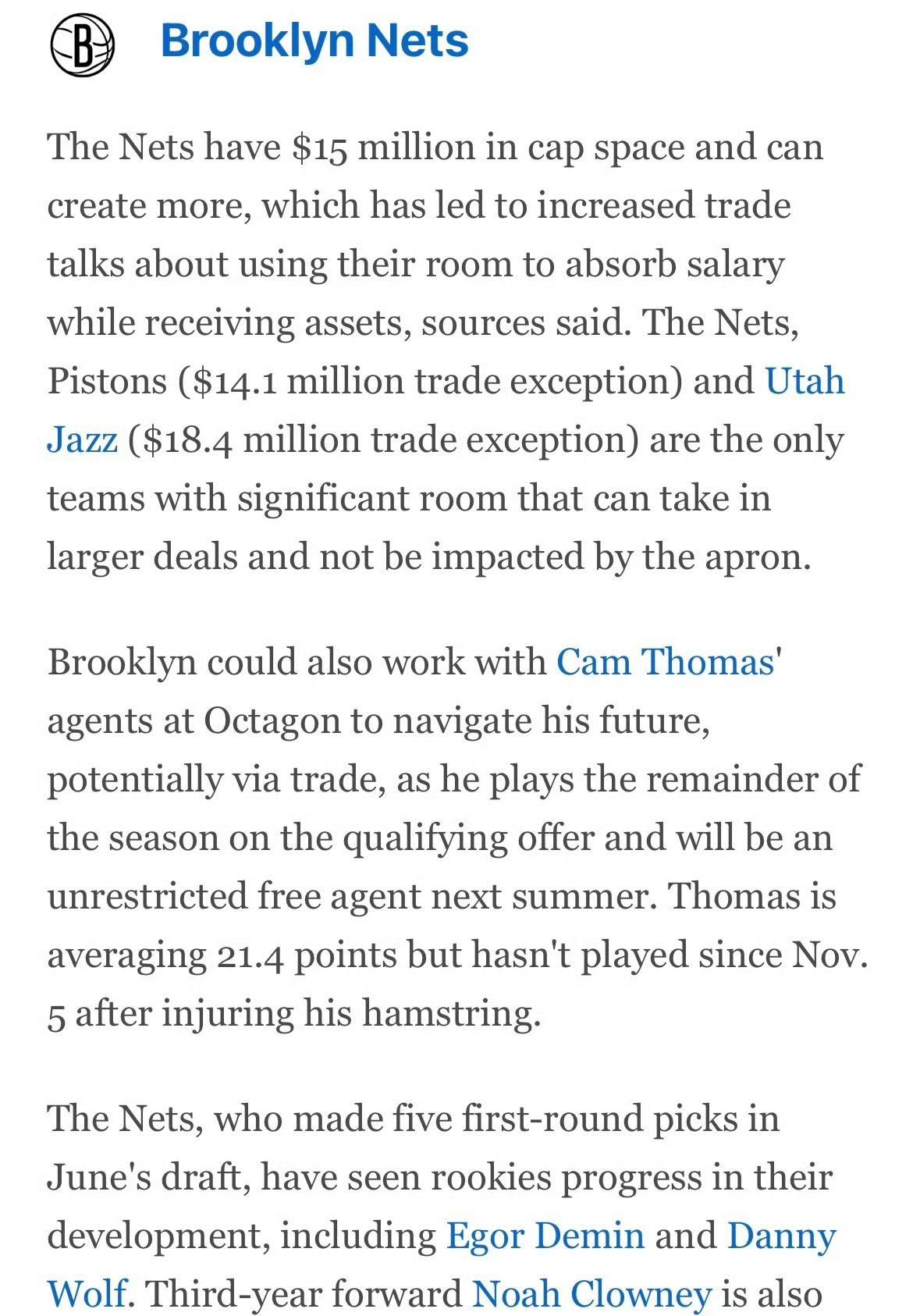 Shams: 据消息人士透露,篮网目前手握1500万美元的薪资空间,且有能力进一步扩容,这也让围绕球队的交易谈判热度上升——他们计划利用现有薪资空间接手其他球队的合同,同时换取相应的资产。 全联盟仅有三支球队拥有充足的操作空间,能够承接大额交易且不受土豪线限制,分别是篮网、持有1410万美元交易特例的活塞,以及手握1840万美元交易特例的犹他爵士。 篮网可以与托马斯合作,规划其未来去向,交易或将成为潜在方案之一。托马斯本赛季以资质报价合同效力球队,明年夏天将成为完全自由球员。他目前场均能贡献21.4分,但自11月5日遭遇腿筋伤势后便一直缺阵。