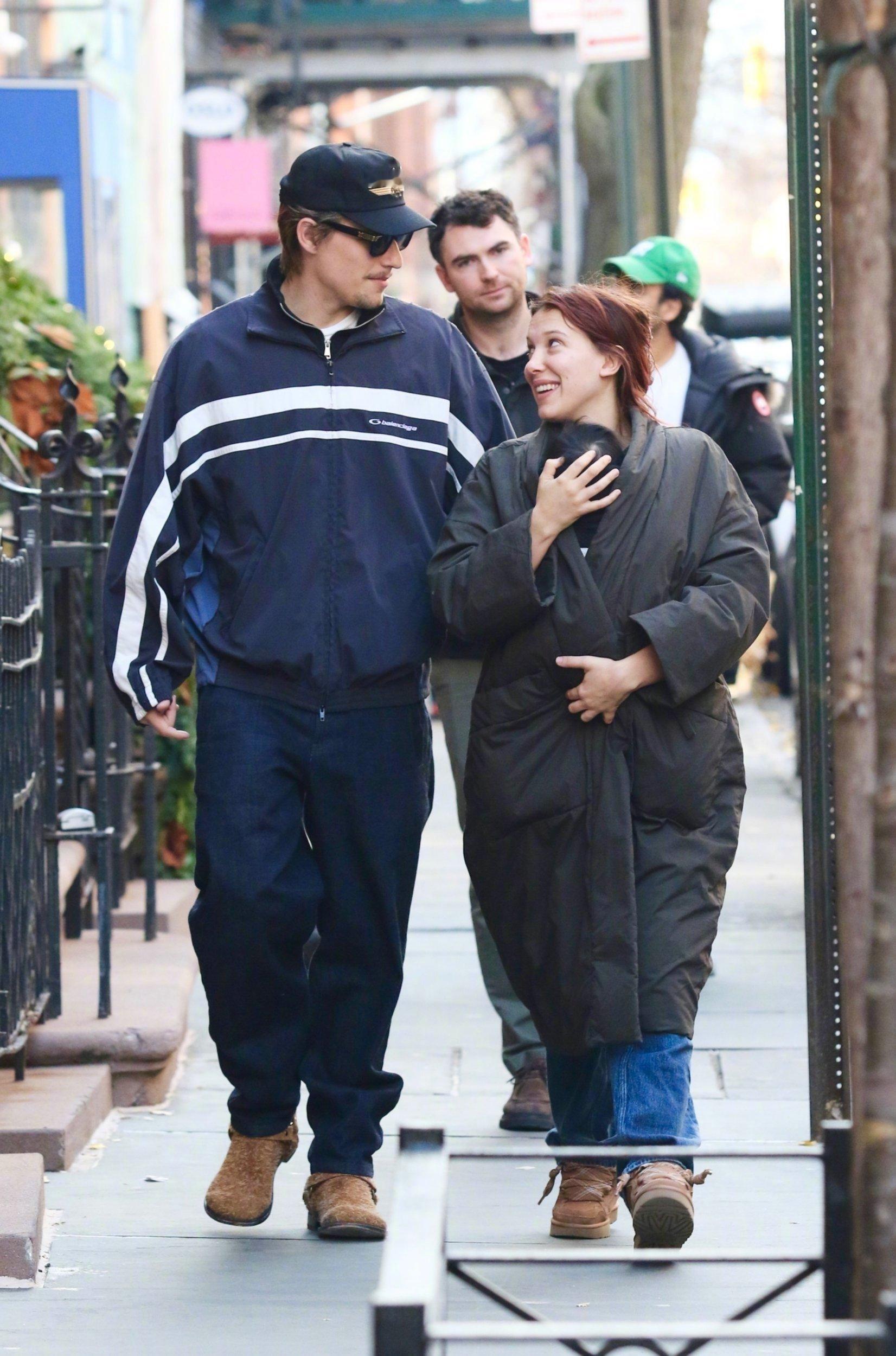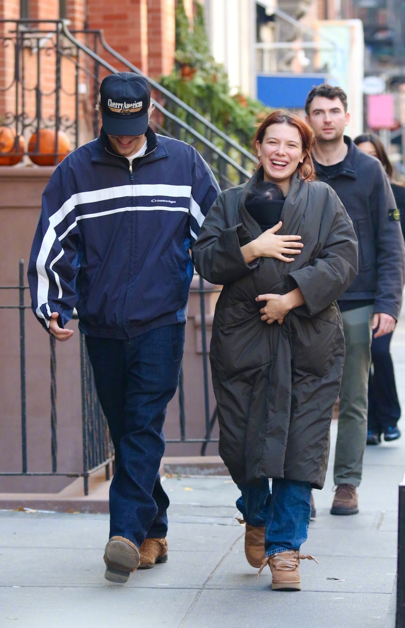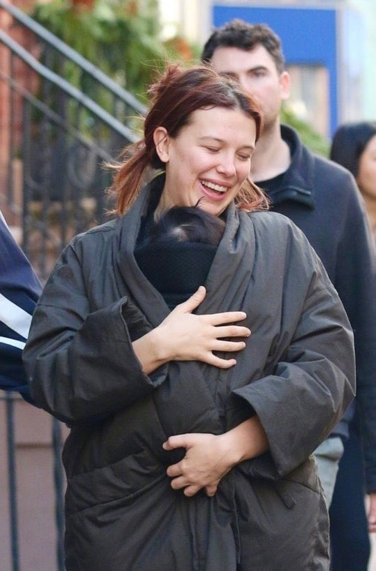 小11抱女儿出街 “小11”米莉·波比·布朗怀里抱着女儿,与丈夫Jake Bongiovi纽约出街,把宝宝保护得很好的米莉~