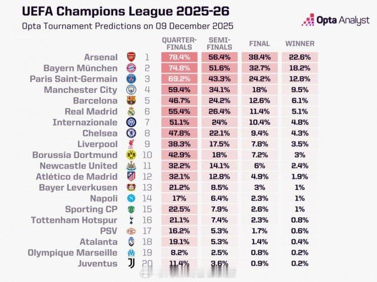 opta本赛季欧冠夺冠概率:1、阿森纳:22.6%2、拜仁:18.2%3、巴黎:12.8%4、曼城:9.5%5、巴萨:6.1% 欧冠联赛 阿森纳著名教授