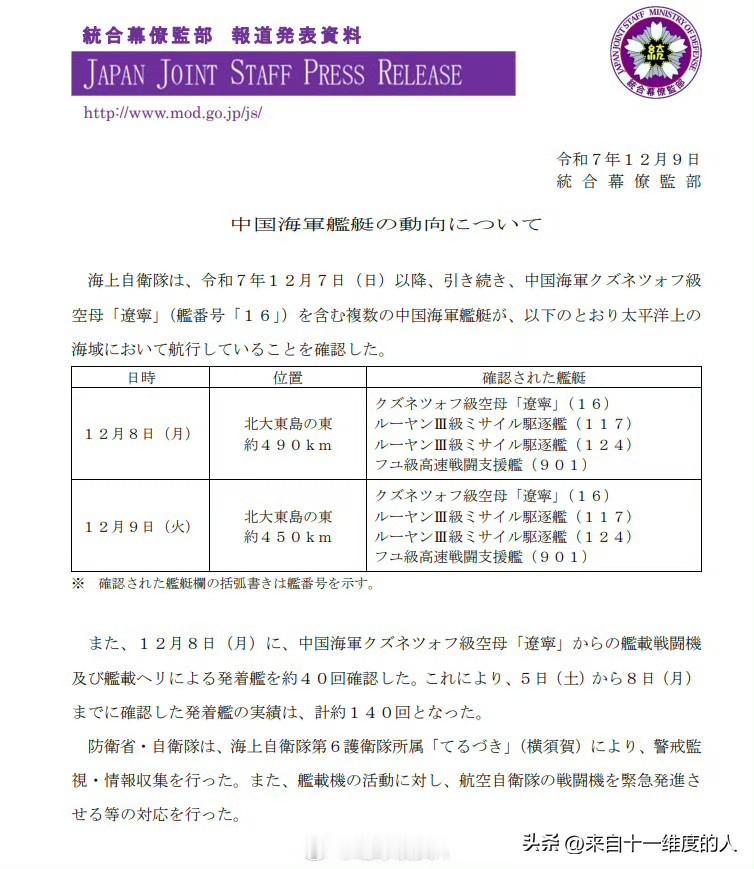 鬼子跟丢了“辽宁号”航母战斗群,被日本网民喷得那叫一个“天昏地暗”,仿佛要被喷出“翔”来。之后,防卫省统合幕僚监部赶忙发布了“辽宁号”航母战斗群的去向。 防卫省统合幕僚监部 2025.12.09 公布: 关于中国海军舰艇的动向,2025 年 12 月 9 日,中国海军 001 型航母辽宁舰(16)等多艘舰艇在北大东岛附近等太平洋海域航行,就像一群神秘的海上侠客在大洋中穿梭。除辽宁舰外,舰艇还包括 052D 型西宁舰(117)、开封舰(124)以及 901 型补给舰呼伦湖舰(901)共 4 艘。不过呢,舰艇图片,无。 这“御用摄影师”不知道是胆小如鼠不敢跟拍,还是像个无头苍蝇压根就不知道我军具体位置,拿不出图像证实。我觉得更大可能是根据美军情报,就像个没主见的“跟屁虫”。 辽宁舰编队