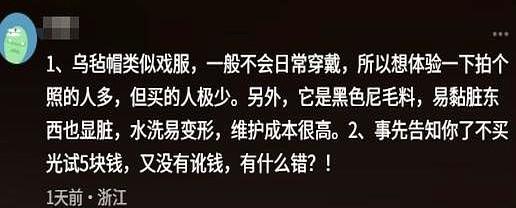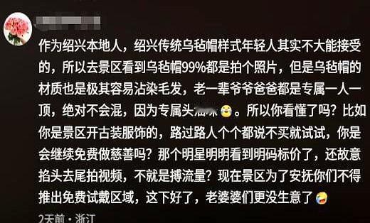 试戴一下帽子就要5块?这钱收得到底冤不冤。 起初演员洪剑涛在绍兴景区被老奶奶收了5元试戴费,网上炸了锅,都说是“宰客”。可没多久,本地人出来解释,大家才明白过来,这事儿不简单。 这乌毡帽,这乌毡帽可是浙江的非物质文化遗产。纯羊毛手工压制,工序复杂得很。材质又金贵,黑色的羊毛特别容易吸汗吸灰,一洗就变形,戴的人多了,帽子品相就差了,根本卖不出去。 现在好多游客就是图个新鲜,戴上拍个照打卡就走,真心买的没几个。老奶奶一天下来,帽子被试戴个几十上百次,损耗全是自己的。收这5块钱,说白了就是想过滤掉纯拍照的,找找真心想买的客户,也是一种无奈的自保。 其实不光是乌毡帽,你去苏州看绣品,去景德镇看瓷器,很多店里都有“请勿触摸”的牌子。这些手工艺品,都是心血,不是流水线产品。 这5块钱背后,是传统手艺人的生计和文化传播的矛盾。互相多点理解,这事就好办多了。