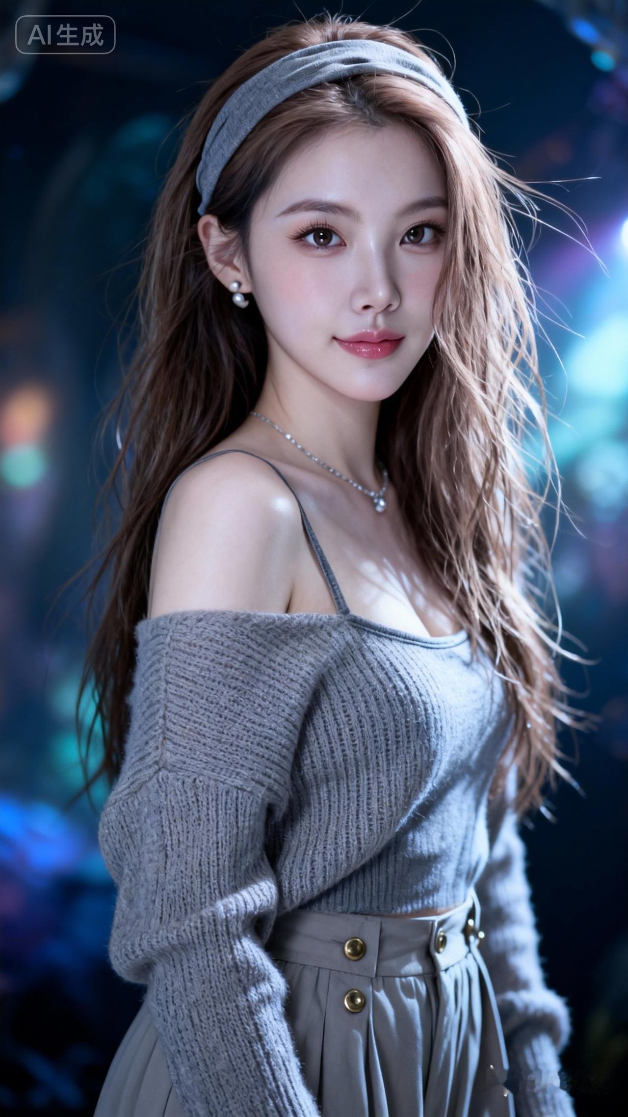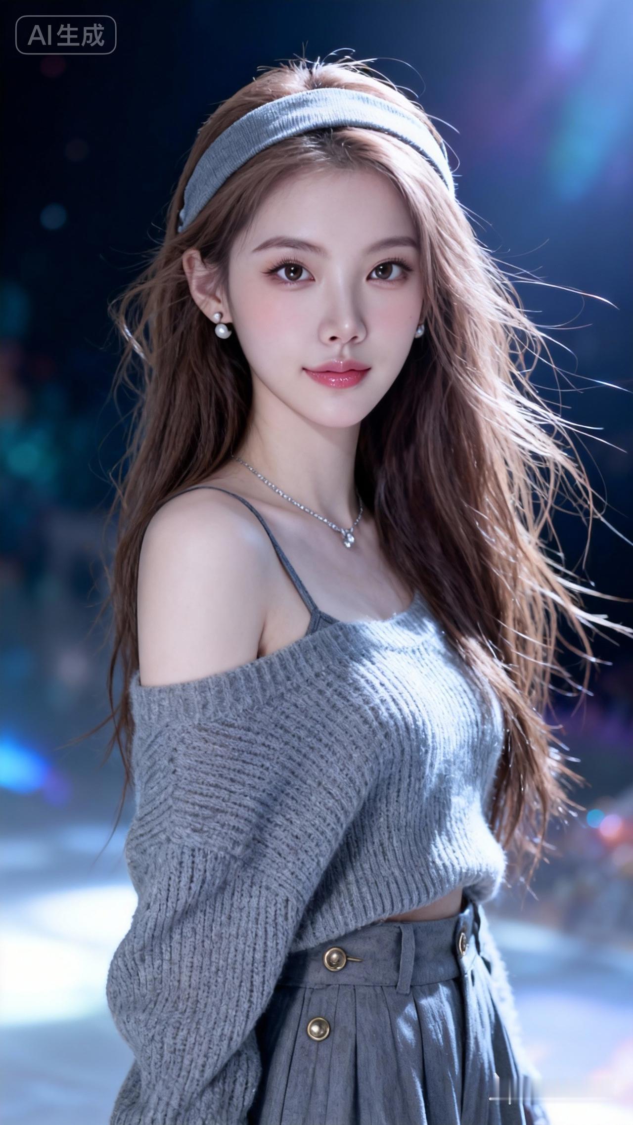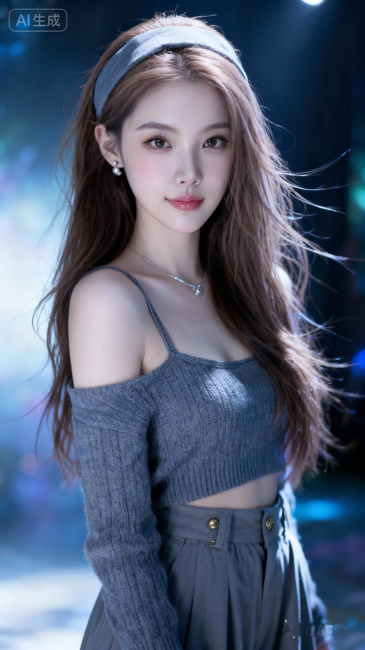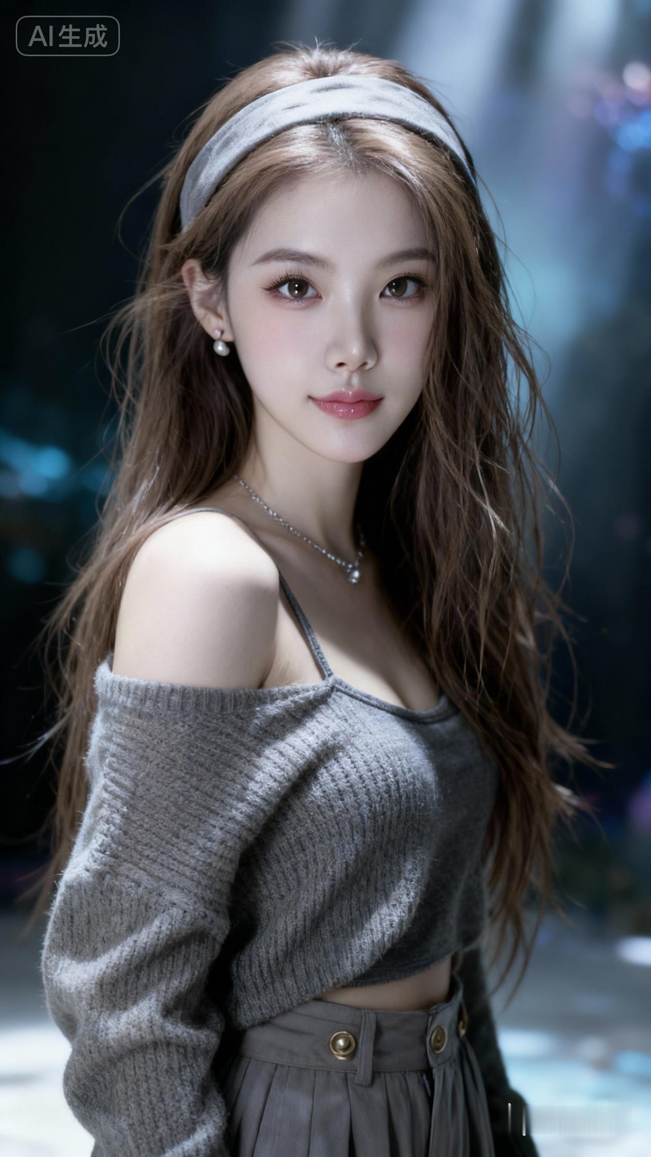 人物直视镜头,披着凌乱的浅棕色长发,真人比例,精致的妆容,伪素颜妆,陶瓷般光滑的皮肤,白皙柔嫩的皮肤,小巧的漂亮鼻子,精致的柳叶眉,皮肤高光,薄薄的唇瓣,唇色光泽