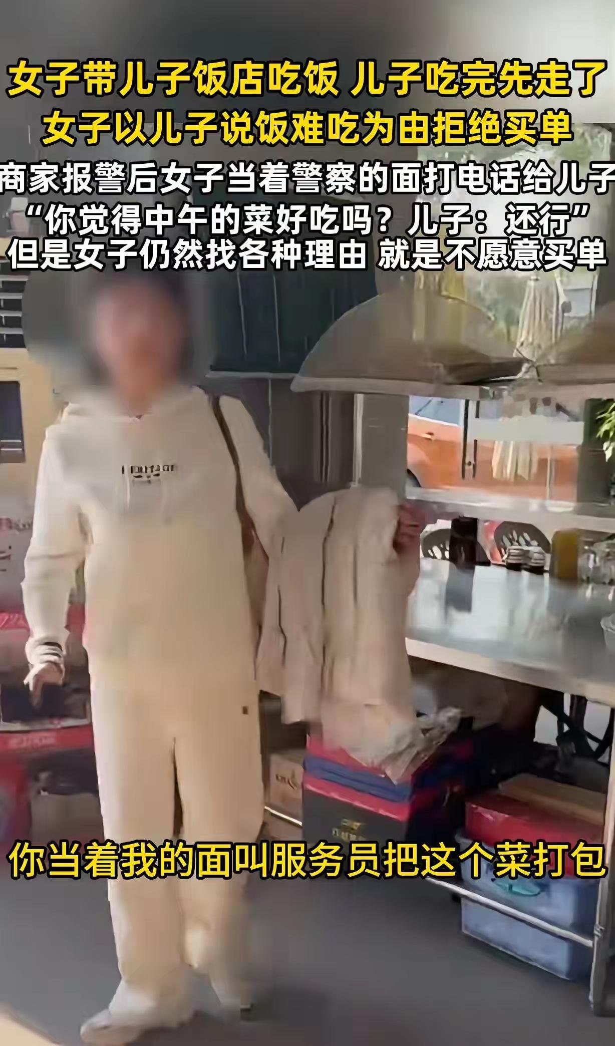“吃不起别吃!”浙江icon,一女子带儿子去餐馆吃完饭,她让儿子先离开,她手机里明明有800元,却拒绝买单,理由是儿子说饭菜难吃,老板气的报了警,没想到,女子竟当着帽子叔叔的面给儿子打电话,女子:你觉得中午的菜好吃吗?儿子:还行!女子啪啪打脸,可她还是不付款,还要求老板把饭菜打包,她要带去相关部门检验。 这起“吃饭不付账”的事件,似乎只是一场普通的家庭小冲突,但细细品味,却折射出社会上一些令人深思的现实问题。我们常说“吃得起,才敢吃得好”,但当“吃不起”成为借口,是否也代表着某些人心中那份“责任感”的缺失? 一方面,这位女子用“饭菜难吃”作为拒付的理由,仿佛在告诉我们:在物价飞涨、生活压力不断增大的今天,有些人已经开始用“拒绝支付”来表达自己的抗议与不满。可问题是,这样的行为,真的只是在“表达情绪”吗?还是在试图用“借口”掩饰内心的无奈与逃避?毕竟,面对餐馆的善意和老板的苦苦哀求,拒绝付款的背后,是不是隐藏着对规则的蔑视?还是对生活的一种无声抗议? 更令人心碎的是,她竟然当着“帽子叔叔”的面打电话给儿子,试图“转移责任”,这种行为更像是一场“戏剧”——用“检验饭菜”来掩盖自己不付账的事实。是不是也反映出一些人内心深处的“无底线”?在这个讲究诚信的社会里,难道“吃饭不付账”也能成为一种“新潮流”? 然而,换个角度想,这件事也让我们看到了家庭教育的缺失。作为母亲,她没有告诉孩子“诚信第一”,反而用“饭菜难吃”作为推脱的借口,似乎在潜移默化中告诉孩子:规则可以被打破,责任可以被推卸。这不禁让人担心:这样的教育方式,是否会让下一代变得越来越“以我为中心”,越来越缺乏责任感? 这件事情引发的,不仅仅是关于“吃饭不付账”的争议,更是社会诚信危机的一面镜子。我们每个人都在这个社会中扮演着自己的角色:是坚守规则的守护者,还是随意践踏规则的“破坏者”?当“吃饭”这件看似简单的小事变成了“责任”的试金石,我们或许应该反思:我们是否还记得“诚信”二字的重量?是否还在用行动去守护这份最基本的社会信任? 或许,这个事件的背后,更值得我们深思的是:面对生活的压力与不公,我们能否坚持底线?在这个浮躁的时代,诚信与责任,才是我们最需要传递的正能量。让这起事件成为一次警醒,而不是任由“吃不起”成为借口的借口。只有每个人都愿意承担起应有的责任,社会的诚信才能真正得以守护。你怎么看?是不是也在某些时刻“吃亏了”,但更希望看到的是,大家都能多一份责任感、多一份诚信,社会才能少一些“吃不起”的尴尬,多一些“愿意付出”的温暖。公司不结账 用餐争议
