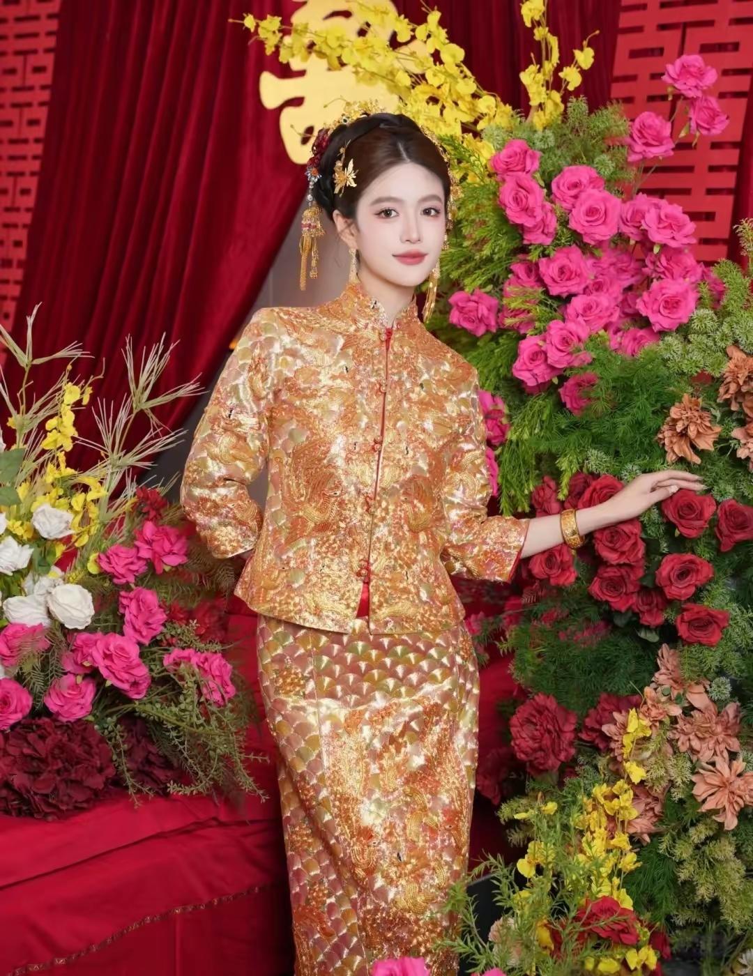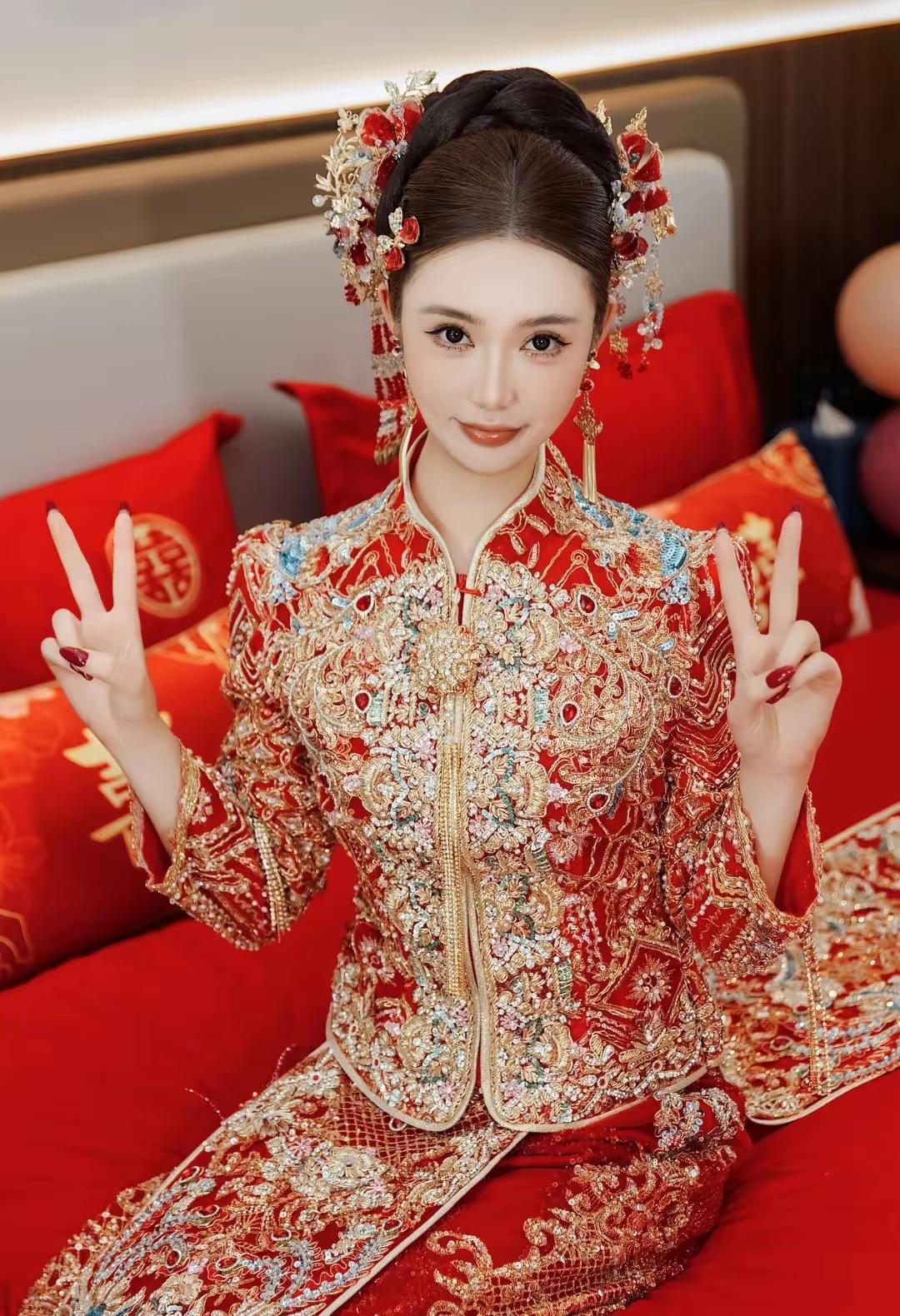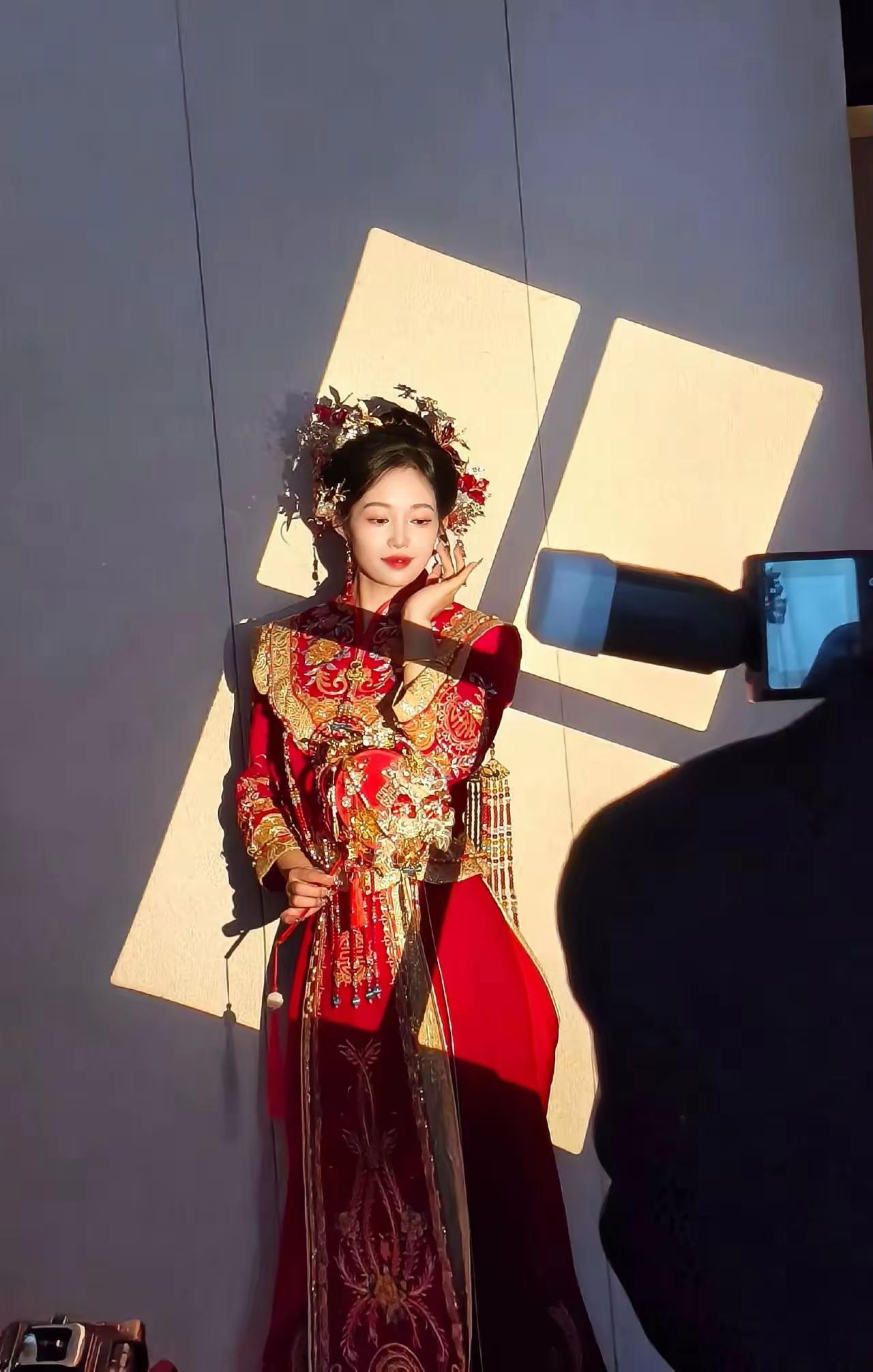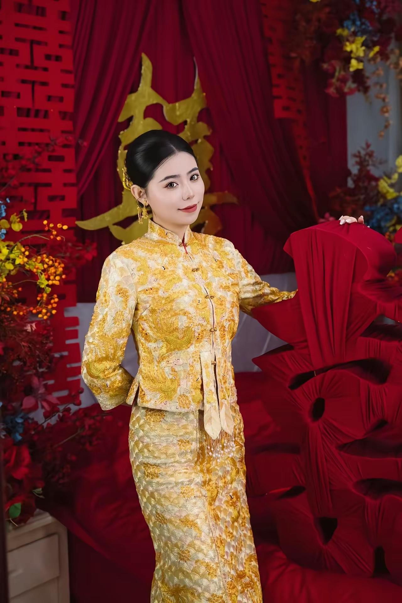 这位美女穿着华丽的礼服,看起来非常惊艳。